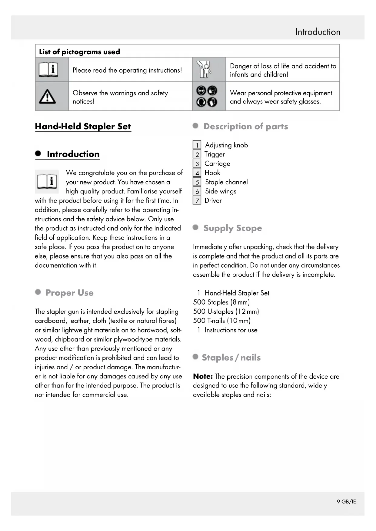 Driver Supply Scope Immediately after unpacking, check that the delivery is complete and that the product and all its parts are in perfect condition. Do not under any circumstances assemble the product if the delivery is incomplete. 1 Hand-Held Stapler Set 500 Staples (8 mm) 500 U-staples (12 mm) 500 T-nails (10 mm) 1 Instructions for use Staples / nails Note: The precision components of the device are designed to use the following standard, widely available staples and nails:10 GB/IE OperationIntroduction / Safety advice / Operation Type