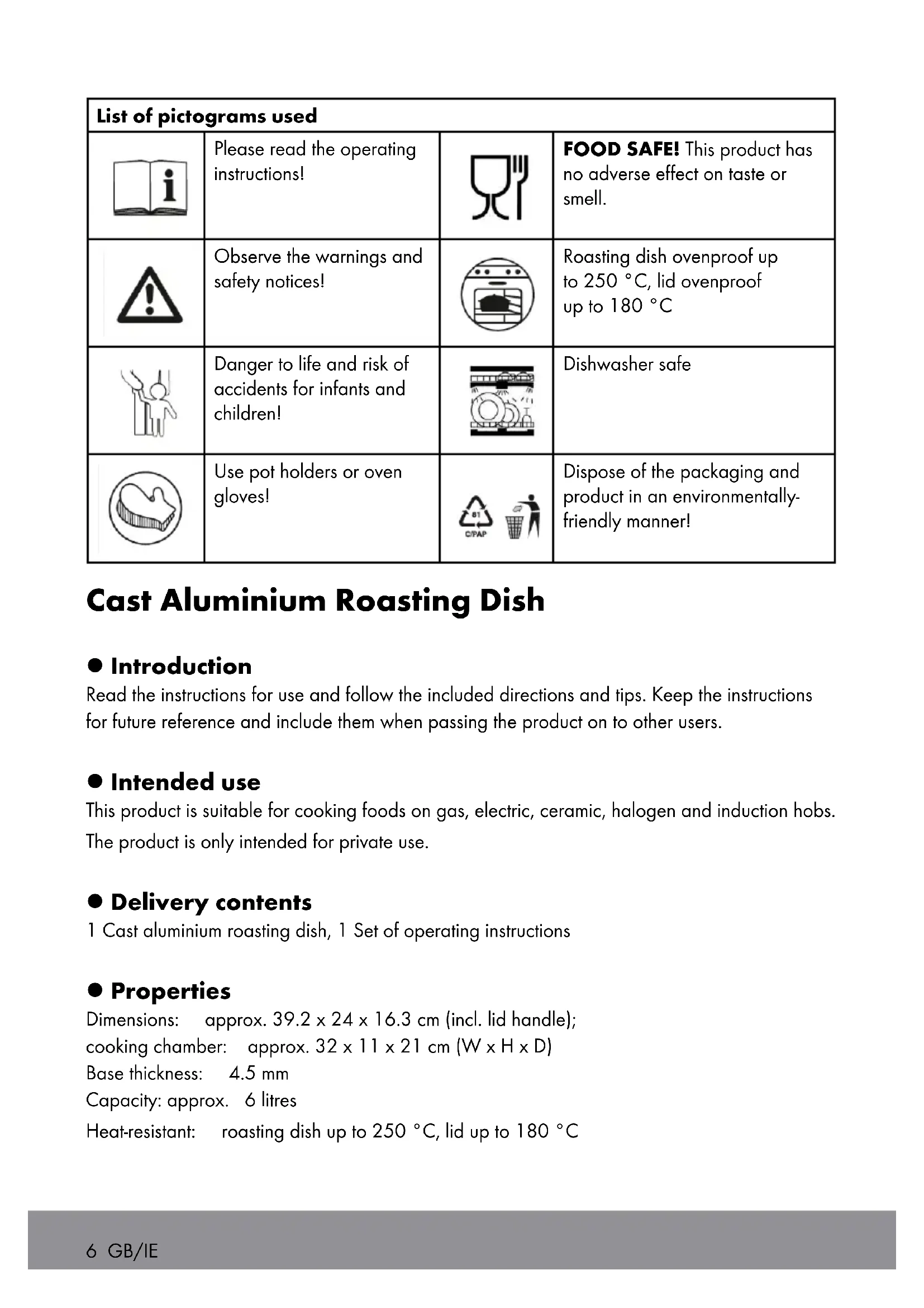 Safety instructions n WARNING! DANGER TO LIFE AND RISK OF ACCIDENT FOR INFANTS AND CHILDREN! Never leave children unsupervised with the packaging material. There is a danger of suffocation. Keep children away from the product. n WARNING! Never leave children unsupervised near hot cooking equipment. n WEAR SAFETY GLOVES! The product gets very hot during cooking. For your safety please therefore use pot holders or oven gloves. n Take caution with hot oil or fat! Do not carry the product containing hot oil or fat through the kitchen. n Do not extinguish burning fat with water, instead suffocate the flames with a blanket or use a fire extinguisher. n Do not rinse the product with cold water. n Do not heat up the product when empty. n Heat up the product at a moderate temperature. Overheating the product will damage the non-stick coating. n Do not slide or drag the product across a glass ceramic hob. n Do not scrape or slice in the product. Use wooden or plastic utensils. n FOOD SAFE! This product has no adverse effect on taste or smell. n For optimal energy use, the cooking zone should be the same size as the base of the product and the product should be placed in the centre of the cooking zone. Only place the product on the cooking zone when the base is dry.l Before first use n Boil water in the product two to three times and clean it with a little washing-up liquid. n Then, grease the inside with some cooking oil. Repeat this process from time to time. Note: Loose screws in the lid can be re-tightened using a household screwdriver or another suitable tool. Note: The effective base diameter of the product is 23.3 x 10.5 cm.