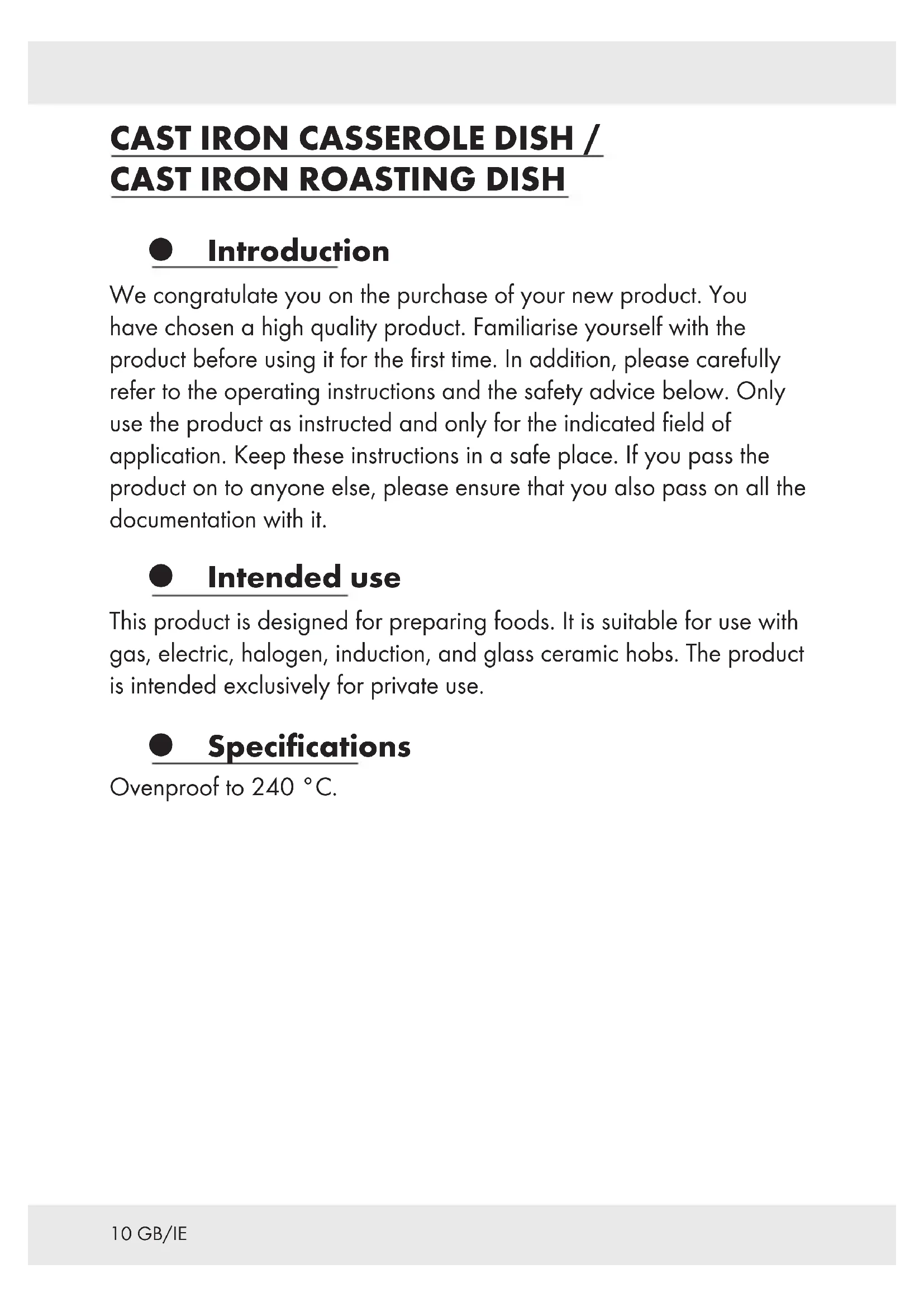 Introduction We congratulate you on the purchase of your new product. You have chosen a high quality product. Familiarise yourself with the product before using it for the first time. In addition, please carefully refer to the operating instructions and the safety advice below. Only use the product as instructed and only for the indicated field of application. Keep these instructions in a safe place. If you pass the product on to anyone else, please ensure that you also pass on all the documentation with it. Intended use This product is designed for preparing foods. It is suitable for use with gas, electric, halogen, induction, and glass ceramic hobs. The product is intended exclusively for private use. Specifications Ovenproof to 240 °C.11GB/IE Safety instructions SAVE ALL SAFETY INSTRUCTIONS AND INSTRUCTIONS FOR USE FOR FUTURE REFERENCE!