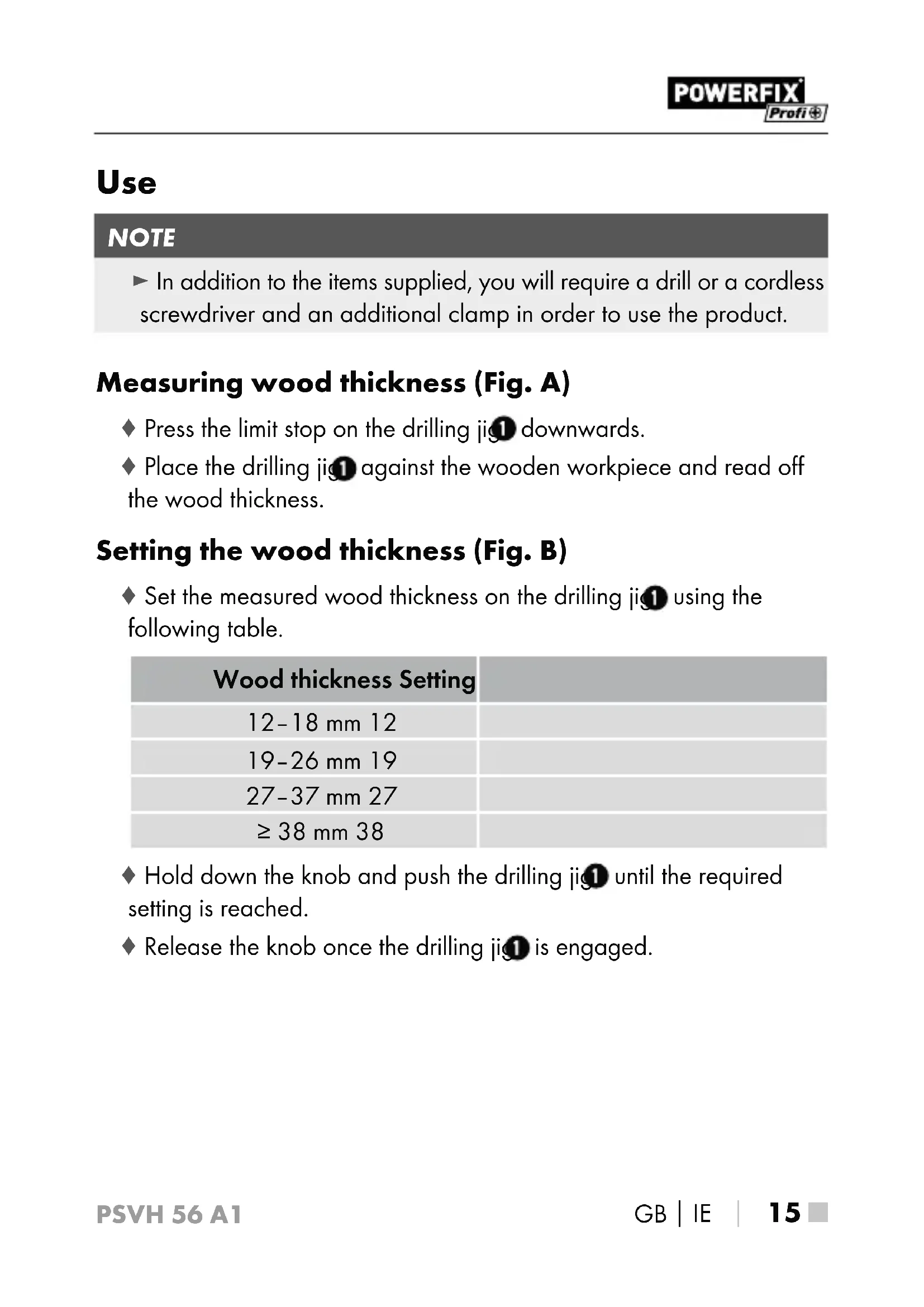 15 ■ Use NOTE ► In addition to the items supplied, you will require a drill or a cordless screwdriver and an additional clamp in order to use the product. Measuring wood thickness (Fig. A) ♦ Press the limit stop on the drilling jig downwards. ♦ Place the drilling jig against the wooden workpiece and read off the wood thickness. Setting the wood thickness (Fig. B) ♦ Set the measured wood thickness on the drilling jig using the following table. Wood thickness Setting 12–18 mm 12 19–26 mm 19 27–37 mm 27 ≥ 38 mm 38 ♦ Hold down the knob and push the drilling jig until the required setting is reached. ♦ Release the knob once the drilling jig is engaged.PSVH 56 A1 ■ 16