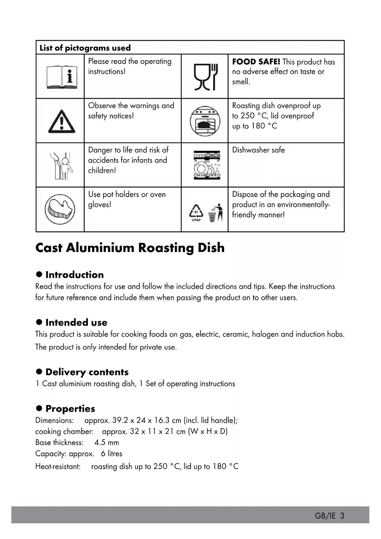 IAN 336970_2001 GB IE NI DK BE NLGB/IE Operation and safety notes Page 3 DE/AT/CH Bedienungs- und Sicherheitshinweise Seite 6 DK Brugs- og sikkerhedsanvisninger Side 9 FR/BE Instructions d‘utilisation et consignes de sécurité Côté 12 NL/BE Bedienings- en veiligheidsinstructies Kant 15GB/IE 3 List of pictograms used Please read the operating instructions! FOOD SAFE! This product has no adverse effect on taste or smell. Observe the warnings and safety notices! Roasting dish ovenproof up to 250 °C, lid ovenproof up to 180 °C Danger to life and risk of accidents for infants and children! Dishwasher safe Use pot holders or oven gloves! Dispose of the packaging and product in an environmentally- friendly manner! Cast Aluminium Roasting Dish l Introduction Read the instructions for use and follow the included directions and tips. Keep the instructions for future reference and include them when passing the product on to other users. l Intended use This product is suitable for cooking foods on gas, electric, ceramic, halogen and induction hobs. The product is only intended for private use. l Delivery contents 1 Cast aluminium roasting dish, 1 Set of operating instructions l Properties Dimensions: approx. 39.2 x 24 x 16.3 cm (incl. lid handle); cooking chamber: approx. 32 x 11 x 21 cm (W x H x D) Base thickness: 4.5 mm Capacity: approx. 6 litres Heat-resistant: roasting dish up to 250 °C, lid up to 180 °C4 GB/IE Suitable for the following environments: Gas stove Induction hob Electric stove Halogen hob Ceramic glass hob