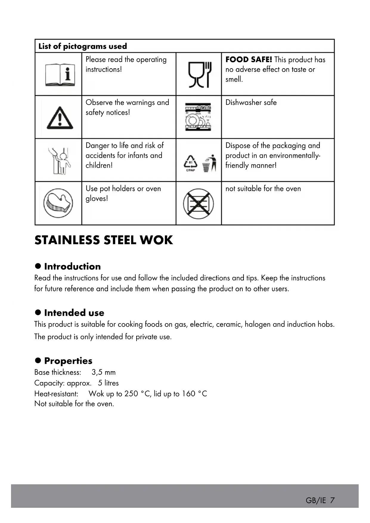 l Introduction Read the instructions for use and follow the included directions and tips. Keep the instructions for future reference and include them when passing the product on to other users. l Intended use This product is suitable for cooking foods on gas, electric, ceramic, halogen and induction hobs. The product is only intended for private use. l Properties Base thickness: 3,5 mm Capacity: approx. 5 litres Heat-resistant: Wok up to 250 °C, lid up to 160 °C Not suitable for the oven. GB/IE 7l Safety instructions n WARNING! DANGER TO LIFE AND RISK OF ACCIDENT FOR INFANTS AND CHILDREN! Never leave children unsupervised with the packaging material. There is a danger of suffocation. Keep children away from the product. n WARNING! Never leave children unsupervised near hot cooking equipment. n WEAR SAFETY GLOVES! The product gets very hot during cooking. For your safety please therefore use pot holders or oven gloves. n Take caution with hot oil or fat! Do not carry the product containing hot oil or fat through the kitchen. n During cooking it is extremely important not to lose sight of the product while you are heating grease in it. Grease can overheat very quickly and ignite. Do not place meat which is still dripping with a hot hob could easily cause a fire. n Do not extinguish burning fat with water, instead suffocate the flames with a blanket or use a fire extinguisher. n Do not rinse the product with cold water. n Do not heat up the product when empty. n Do not slide or drag the product across a glass ceramic hob. n Do not scrape or slice in the product. Use wooden or plastic utensils. n Heat up the product at a moderate temperature. n Do not overheat the product. If it has been overheated, ventilate the area well. n High temperatures may discolour the exterior of the product. This does not indicate faulty material, nor does it impair the product’s quality or function. Suitable for the following environments: Gas stove Induction hob Electric stove Halogen hob Ceramic glass hob
