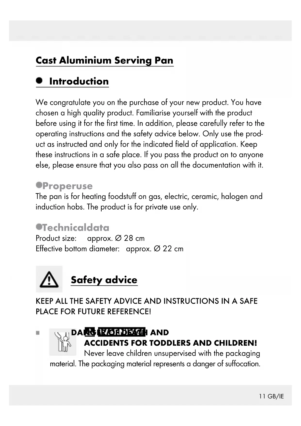 ACCIDENTS FOR TODDLERS AND CHILDREN! Never leave children unsupervised with the packaging material. The packaging material represents a danger of suffocation.12 GB/IE Children frequently underestimate the dangers. Always keep chil- dren away from the packaging material. DANGER OF INJURY! Please note that the handles may become hot during cooking. For your safety, use a potholder or barbecue gloves. Do not use the lid if the knob is loose. Never use the pan if the handles are loose. Retighten the screw joint of the handles if necessary. DANGER OF DAMAGE TO PROPERTY! Pots and pans in which fat is being heated up must never be left unattended. Fat can very quickly overheat and ignite. Never try to extinguish a fat fire with water. Cover the flames with a pan lid or a thick cloth. Use heat resistant plastic or wooden kitchen utensils in order not to damage the non-stick coating. Do not cut food directly in the pan. Do not place meat which is still dripping with liquid into hot fat. The fat splattering out on to a hot hob could easily cause a fire. To avoid heat loss, choose a hotplate with a diameter of the pan that matches. The diameter size of this item is approx. Ø 22 cm. The item is suitable for keeping dishes warm inside the oven (max. 160 °C for 1 hour). Clean the product after used. We recommend cleaning by hand with hot water and detergent as the cleaning in the dishwasher can cause discoloration of the aluminum parts. ATTENTION! The glass lid is fragile / not impact-resistant! For washing the pan by hand, use hot water with a little ordinary washing-up liquid. Avoid using sharp or pointed objects for this in order not to damage the coating.13 GB/IE Do not use harsh scouring agents. ATTENTION! RISK OF SCRATCHES! Do not move the cook- ware back and forth on glass-ceramic hobs! We recommend before cooking to wipe briefly the surface of the hob and the cookware bottom with a clean, lint-free cloth (e.g. microfiber) to reduce the risk of scratches. Never hold the hot product under cold running water. The under- side of the product may be damaged or fall off. FOOD-SAFE! This product has no adverse effect on taste or smell. The product is suitable for the dishwasher. Note for induction hobs Note: A noise may occur under certain conditions, resulting from the electromagnetic properties of the heat source and the pot / pan. This is totally normal and does not imply that your induction hob or your cookware is damaged. Place the pot / pan in the middle of the induction hotplate. CAUTION! High heating-up rate! Do not overheat cookware when preheating. The room must be aired out well, in the event cookware overheat. Usage Before first use, remove any stickers or labels from the article and rinse it in hot water.14 GB/IE Before using the pan for the first time, boil it out with water 2 to 3 times to completely remove all manufacturing residue. Lightly grease the pan. Do not overheat the pan while empty or filled to prevent the non- stick effect from weakening due to damage to the coating. Heat up the food at a higher / medium heat setting and then let it cook at a lower heat setting until ready. Disposal The packaging is made entirely of recyclable materials, which you may dispose of at local recycling facilities. Contact your local refuse disposal authority for more details of how to dispose of your worn-out product. Warranty The product has been manufactured to strict quality guidelines and meticulously examined before delivery. In the event of product defects you have legal rights against the retailer of this product. Your legal rights are not limited in any way by our warranty detailed below. The warranty for this product is 3 years from the date of purchase. The warranty period begins on the date of purchase. Please keep the original sales receipt in a safe location. This document is required as your proof of purchase. Should this product show any fault in materials or manufacture within 3 years from the date of purchase, we will repair or replace it – at our15 GB/IE choice – free of charge to you. This warranty becomes void if the product has been damaged, or used or maintained improperly. The warranty applies to defects in material or manufacture. This warranty does not cover product parts subject to normal wear, thus possibly considered consumables (e.g. batteries) or for damage to fragile parts, e.g. switches, rechargeable batteries or glass parts. Warranty claim procedure To ensure quick processing of your case, please observe the following instructions: Please have the till receipt and the item number (e.g. IAN 123456_7890) available as proof of purchase. You will find the item number on the rating plate, an engraving on the front page of the instructions for use (bottom left), or as a sticker on the rear or bottom of the product. If functional or other defects occur, please contact the service department listed either by telephone or by e-mail. You can return a defective product to us free of charge to the service address that will be provided to you. Ensure that you enclose the proof of purchase (till receipt) and information about what the defect is and when it occurred.16 GB/IE Service Service Great Britain Tel.: 08000569216 E-Mail: owim@lidl.co.uk Service Ireland Tel.: 1800 200736 E-Mail: owim@lidl.ie17 FR/BE Introduction ....................................................................... Page 18 Utilisation conforme ................................................................ Page 18 Caractéristiques techniques .................................................... Page 18 Consignes de sécurité ............................................... Page 18 Remarque relative aux cuisinières à induction .......................................................................... Page 20 Utilisation ............................................................................ Page 21 Traitement des déchets ............................................ Page 21 Garantie .......
