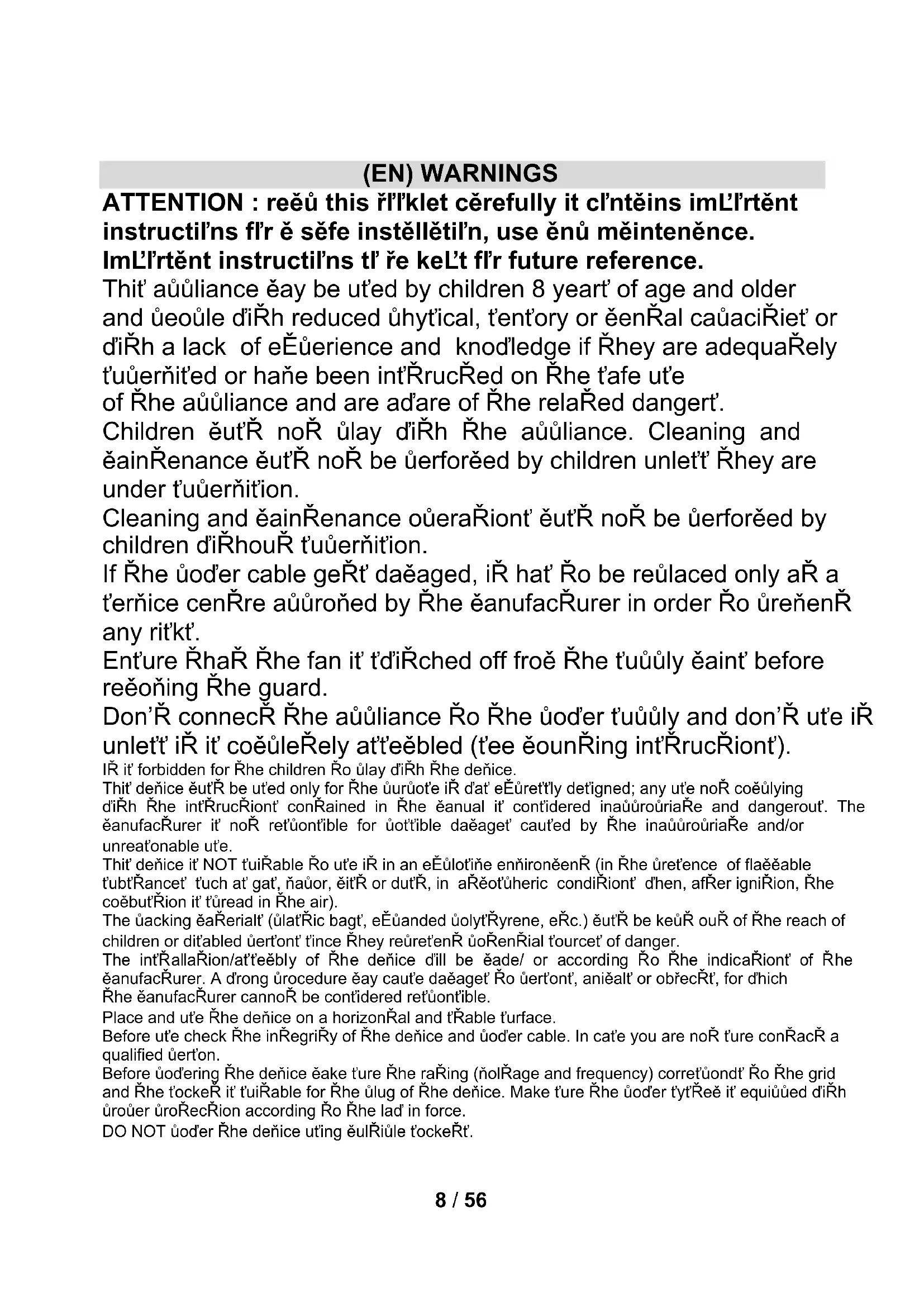 (IT) GARANZIA Condizioni La garanzia ha validità 24 mesi dalla data d’acquisto. La presente garanzia è valida solo se viene correttamente compilata ed accompagnata dallo scontrino fiscale che ne prova la data di acquisto. L’apparecchio deve essere consegnato esclusivamente presso un nostro Centro Assistenza autorizzato. Per garanzia si intende la sostituzione o la riparazione dei componenti dell’apparecchio che risultano difettosi all’origine per vizi di fabbricazione. Viene comunque garantita l’assistenza (a pagamento) anche a prodotti fuori garanzia. Il consumatore è titolare dei diritti applicabili dalla legislazione nazionale disciplinante la vendita dei beni di consumo; questa garanzia lascia impregiudicati tali diritti. La Casa costruttrice declina ogni responsabilità per eventuali danni a persone, animali o cose, conseguenti ad uso improprio dell’apparecchio e alla mancata osservanza delle prescrizioni indicate nell’apposito libretto istruzioni. Limitazioni Ogni diritto di garanzia e ogni nostra responsabilità decadono se l’apparecchio è stato: - Manomesso da parte di personale non autorizzato. -Impiegato, conservato o trasportato in modo improprio. Sono comunque escluse dalla garanzia le perdite di prestazioni estetiche o tali da non compromettere la sostanza delle funzioni.Se nonostante la cura nella selezione dei materiali e l’impegno nella realizzazione del prodotto che Lei ha appena acquistato si dovessero riscontrare dei difetti, o qualora avesse bisogno di informazioni, Vi consigliamo di telefonare al rivenditore di zona.8 / 56 (EN) WARNINGS ATTENTION : read this booklet carefully it contains important instructions for a safe installation, use and maintenance. Important instructions to be kept for future reference. This appliance may be used by children 8 years of age and older and people with reduced physical, sensory or mental capacities or with a lack of experience and knowledge if they are adequately supervised or have been instructed on the safe use of the appliance and are aware of the related dangers. Children must not play with the appliance. Cleaning and maintenance must not be performed by children unless they are under supervision. Cleaning and maintenance operations must not be performed by children without supervision. If the power cable gets damaged, it has to be replaced only at a service centre approved by the manufacturer in order to prevent any risks. Ensure that the fan is switched off from the supply mains before removing the guard. Don’t connect the appliance to the power supply and don’t use it unless it is completely assembled (see mounting instructions). It is forbidden for the children to play with the device. This device must be used only for the purpose it was expressly designed; any use not complying with the instructions contained in the manual is considered inappropriate and dangerous. The manufacturer is not responsible for possible damages caused by the inappropriate and/or unreasonable use. This device is NOT suitable to use it in an explosive environment (in the presence of flammable substances such as gas, vapor, mist or dust, in atmospheric conditions when, after ignition, the combustion is spread in the air). The packing materials (plastic bags, expanded polystyrene, etc.) must be kept out of the reach of children or disabled persons since they represent potential sources of danger. The installation/assembly of the device will be made/ or according to the indications of the manufacturer. A wrong procedure may cause damages to persons, animals or objects, for which the manufacturer cannot be considered responsible. Place and use the device on a horizontal and stable surface. Before use check the integrity of the device and power cable. In case you are not sure contact a qualified person. Before powering the device make sure the rating (voltage and frequency) corresponds to the grid and the socket is suitable for the plug of the device. Make sure the power system is equipped with proper protection according to the law in force. DO NOT power the device using multiple sockets.9 / 56 If possible, avoid the use of adapters and/or extension cables; if their use is absolutely necessary, use only materials in compliance with the current safety regulations and according to the electrical parameters of the adapters. The device must not be switched on using external timers and/or other remote control devices which are not specified in this manual. DO NOT use or store the device near heat sources (heaters, stoves etc.). DO NOT dip the device in water or other liquids; in case the accidental fall in the water DO NOT try to take it out, but first of all unplug immediately the power cable from the socket. If you use the device for the first time, make sure to remove any label or protective sheet which blocks its proper functioning. Plug and unplug the power cable with dry hands and hold it firmly. Before plugging make sure the start button of the device is in the “OFF” position (turned off). Always unplug the power cable to avoid the overheating and avoid stretching it (do not pull it, tug it or use it to drag the device to which is connected). Avoid placing the power cable on abrasive or sharp surfaces or in positions where it can be damaged easily. DO NOT obstruct totally nor partially the air vents or inserts objects inside. During the functioning do not touch the device with wet body parts, and in any case it is recommended to have between you and the standing surface, an isolating element (for ex. wearing shoes with rubber soles). During the use the device must be keep at a safety distance from any object and/or flammable or potentially explosive substance. In case of malfunction or anomalies during the functioning, switch off the device immediately, turn off the power and check the cause of the anomalies, if possible, with the support of a qualified person. Avoid carrying out operations which are not specified in th