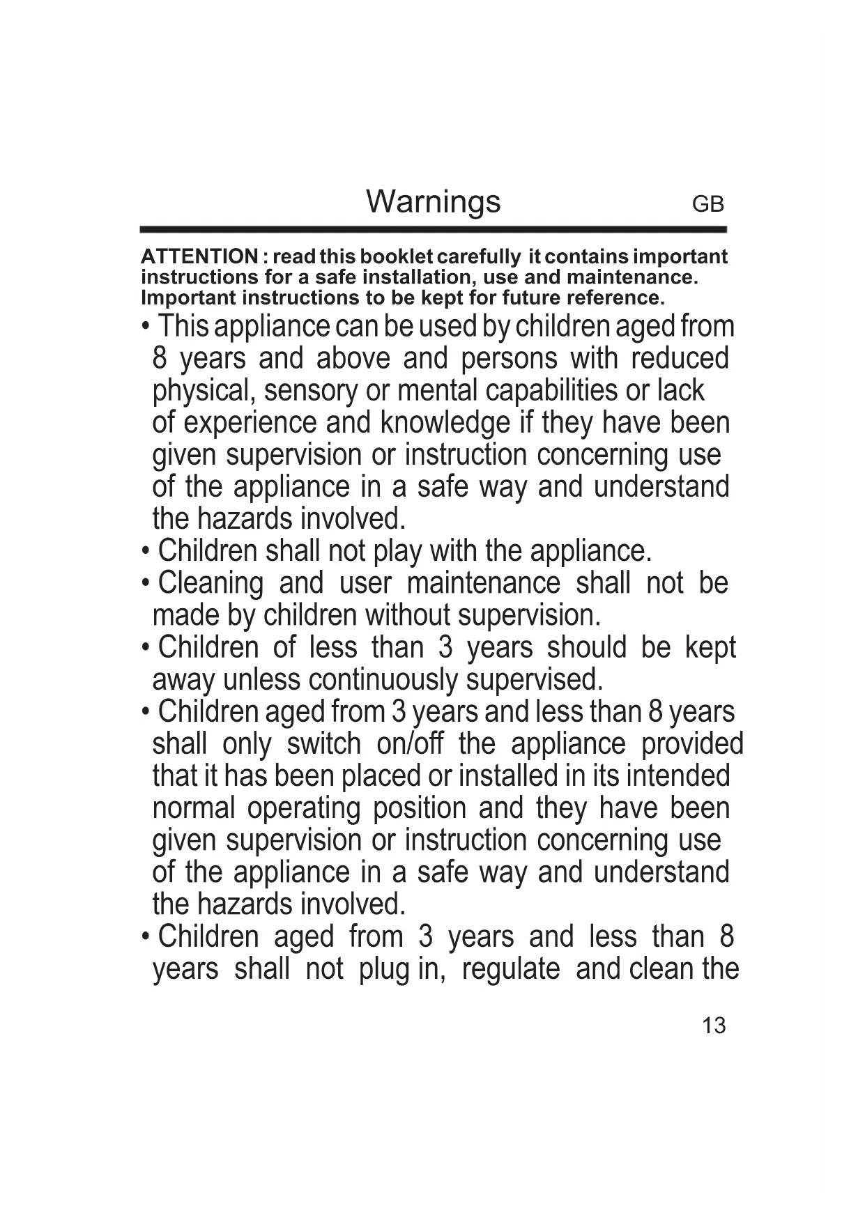 - Children aged from 3 years and less than 8 years shall not plug in, regulate and clean the GB14 appliance or perform user maintenance.