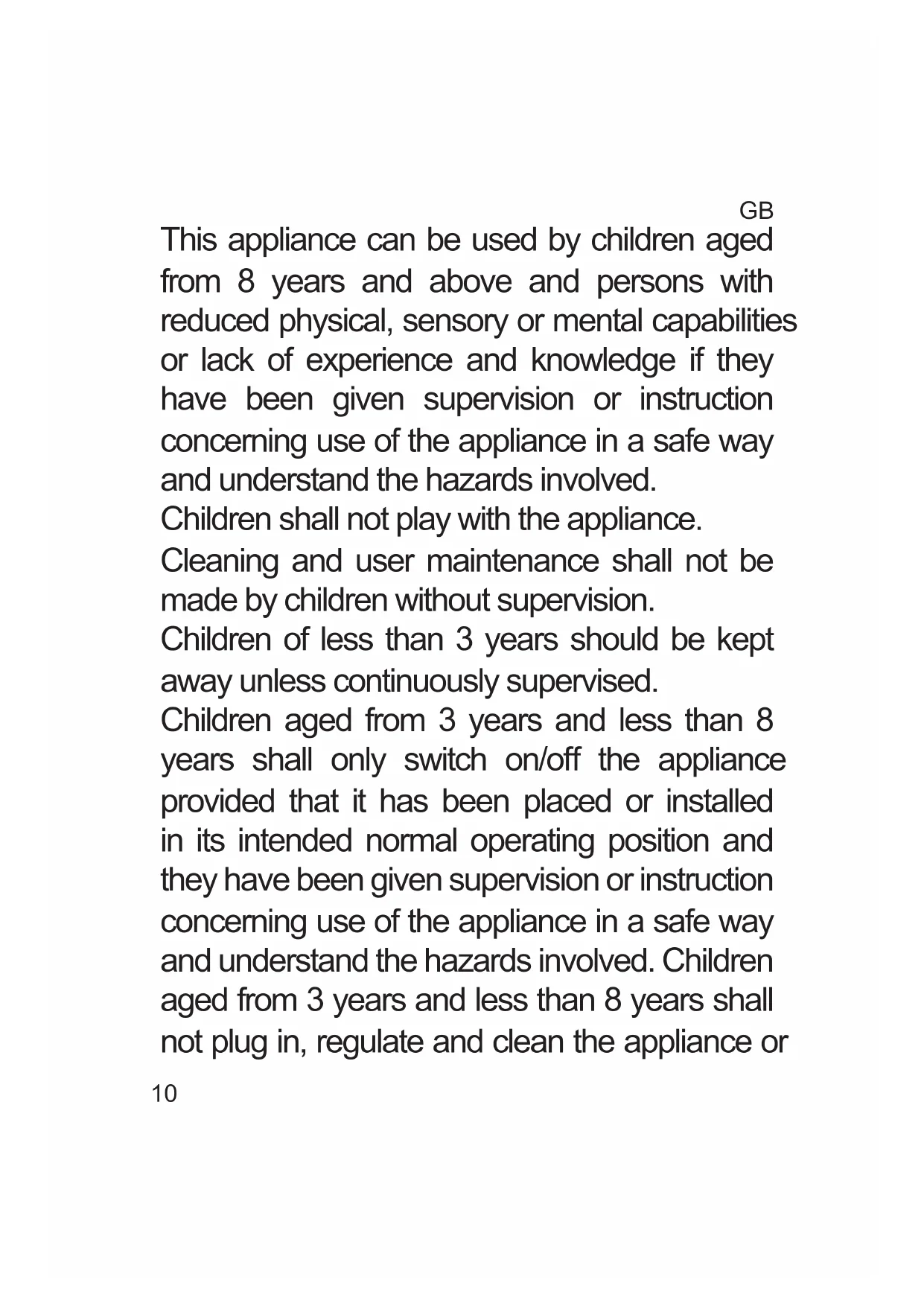 Contatti POLY POOL S.p.A. - via Sottocorna 21/B, 24020 Parre (BG) - Italy10 This appliance can be used by children aged from 8 years and above and persons with reduced physical, sensory or mental capabilities or lack of experience and knowledge if they have been given supervision or instruction concerning use of the appliance in a safe way and understand the hazards involved. Children shall not play with the appliance. Cleaning and user maintenance shall not be made by children without supervision. Children of less than 3 years should be kept away unless continuously supervised. Children aged from 3 years and less than 8 years shall only switch on/o the appliance provided that it has been placed or installed in its intended normal operating position and they have been given supervision or instruction concerning use of the appliance in a safe way and understand the hazards involved. Children aged from 3 years and less than 8 years shall not plug in, regulate and clean the appliance or GB11