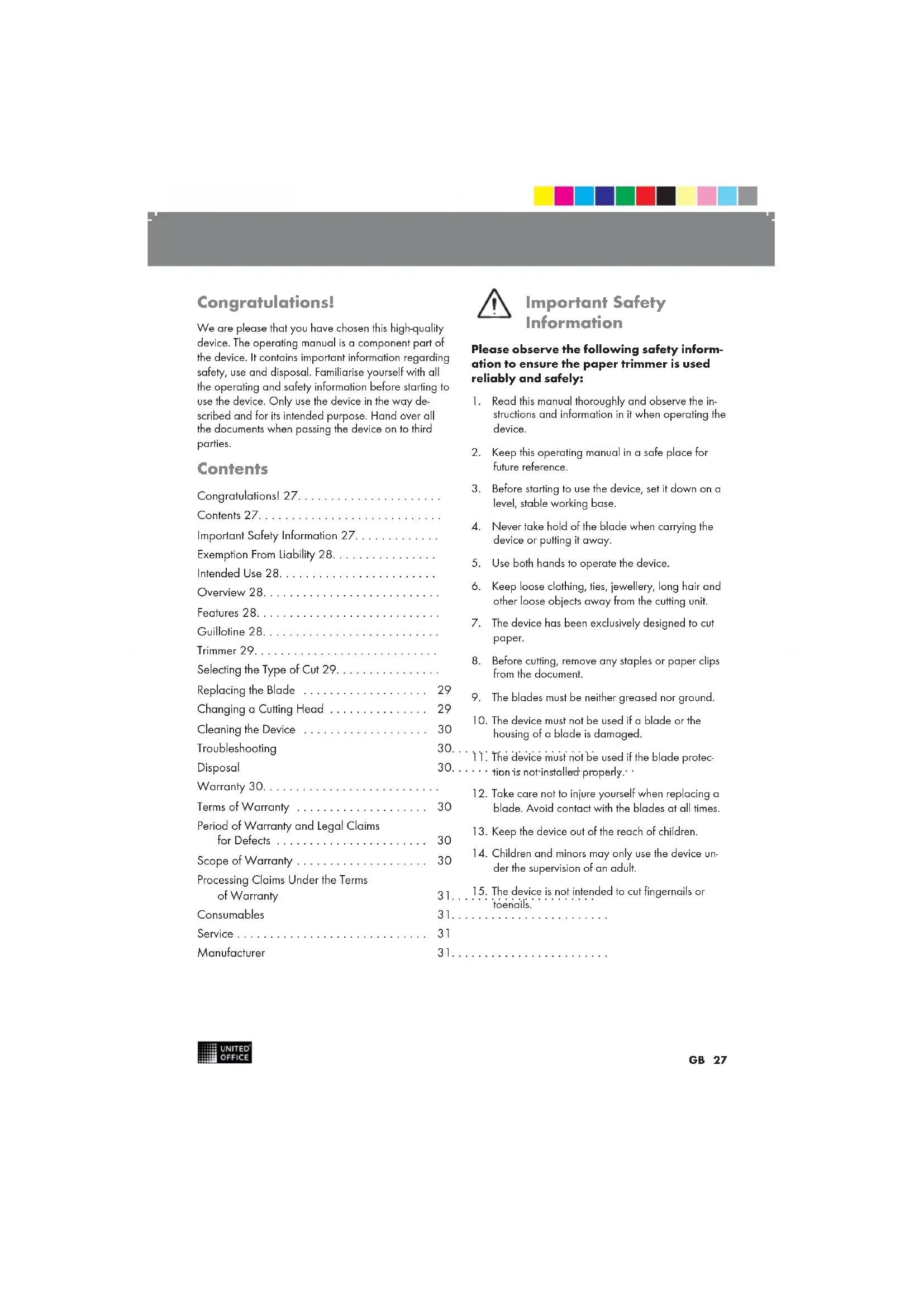 toenails. LB1.pdf 27LB1.pdf 27 15.02.2012 12:05:0415.02.2012 12:05:0428 GB Attention: improper use of the device can result in severe injury! The device must not be operated by children! Keep children away from the device. Note: Failure to observe the safety labels can result in severe personal injury! Exemption From Liability We cannot guarantee that the information which relates to the technical properties of the product or to the product itself contained in this document is correct. The product and, where applicable, its accessories, described in this document are subject to constant improvement and further development. For this reason, we reserve the right to modify components, accessor ies, technical specifications and related documentation of the product described herein at any time without notice. Intended Use This paper trimmer may only be used to cut paper, card, photo paper and laminating foil. Remove all paper clips and staples from paper before using the device to cut the paper! Using the device for any purpose other than the inten ded use described is considered unintended use. It is forbidden to complete any modifications to the device. Contravention results in the annulment of all rights to legal, guarantee and warranty claims. Overview