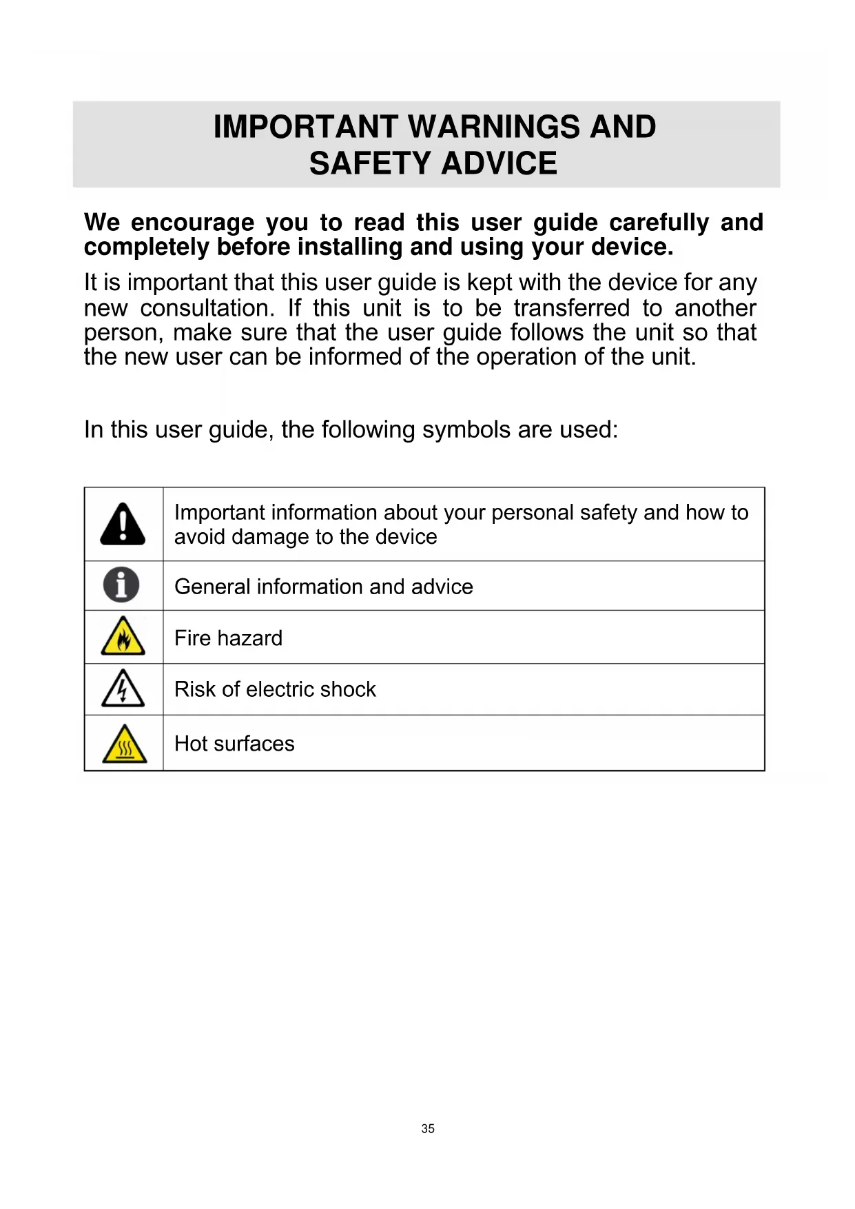 34We encourage you to read this user guide carefully and completely before installing and using your device. It is important that this user guide is kept with the device for any new consultation. If this unit is to be transferred to another person, make sure that the user guide follows the unit so that the new user can be informed of the operation of the unit. In this user guide, the following symbols are used: Important information about your personal safety and how to avoid damage to the device General information and advice Fire hazard Risk of electric shock Hot surfaces