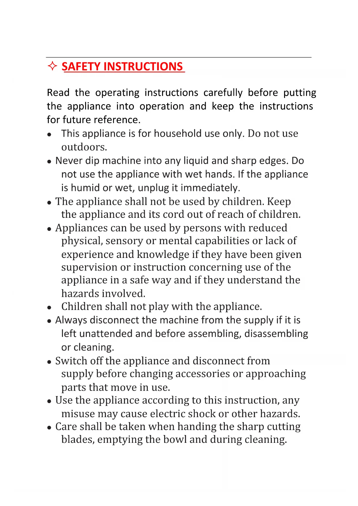France SAFETY INSTRUCTIONS Read the operating instructions carefully before putting the appliance into operation and keep the instructions for future reference. ⚫ This appliance is for household use only. Do not use outdoors. ⚫ Never dip machine into any liquid and sharp edges. Do not use the appliance with wet hands. If the appliance is humid or wet, unplug it immediately. ⚫ The appliance shall not be used by children. Keep the appliance and its cord out of reach of children. ⚫ Appliances can be used by persons with reduced physical, sensory or mental capabilities or lack of experience and knowledge if they have been given supervision or instruction concerning use of the appliance in a safe way and if they understand the hazards involved. ⚫ Children shall not play with the appliance. ⚫ Always disconnect the machine from the supply if it is left unattended and before assembling, disassembling or cleaning. ⚫ Switch off the appliance and disconnect from supply before changing accessories or approaching parts that move in use. ⚫ Use the appliance according to this instruction, any misuse may cause electric shock or other hazards. ⚫ Care shall be taken when handing the sharp cutting blades, emptying the bowl and during cleaning.⚫ If the supply cord is damaged, it must be replaced by the manufacture of its service agent or a similar qualified person in order to avoid a hazard. ⚫ Keep your finger away from moving parts and fitted tools. Never put your fingers etc. in hinge mechanism. ⚫ Use only original spare parts. ⚫ In order to ensure your children’s safety, please keep all packaging (plastic bags, boxes, polystyrene etc.) out of their reach. ⚫ Do not interfere with any safety switches. ⚫ Place the machine on a smooth, flat and stable working surface. ⚫ Be very careful when you handle the blades or inserts. Be especially careful when you remove them from machine, their cutting edges are very sharp. ⚫ Wait until moving parts stop running before you remove the lid of machine. ⚫ Do not exceed the maximum content indicated on the accessories. ⚫ About how to clean surfaces in contact with food, please refer to the section “CLEANING”.USING THE GLASS JAR 【Cool / Hot Processing】 This glass jar could use for cool and hot blending processing, also could be for soup preparing, steam preparing and jam preparation. For cool and hot blending processing: