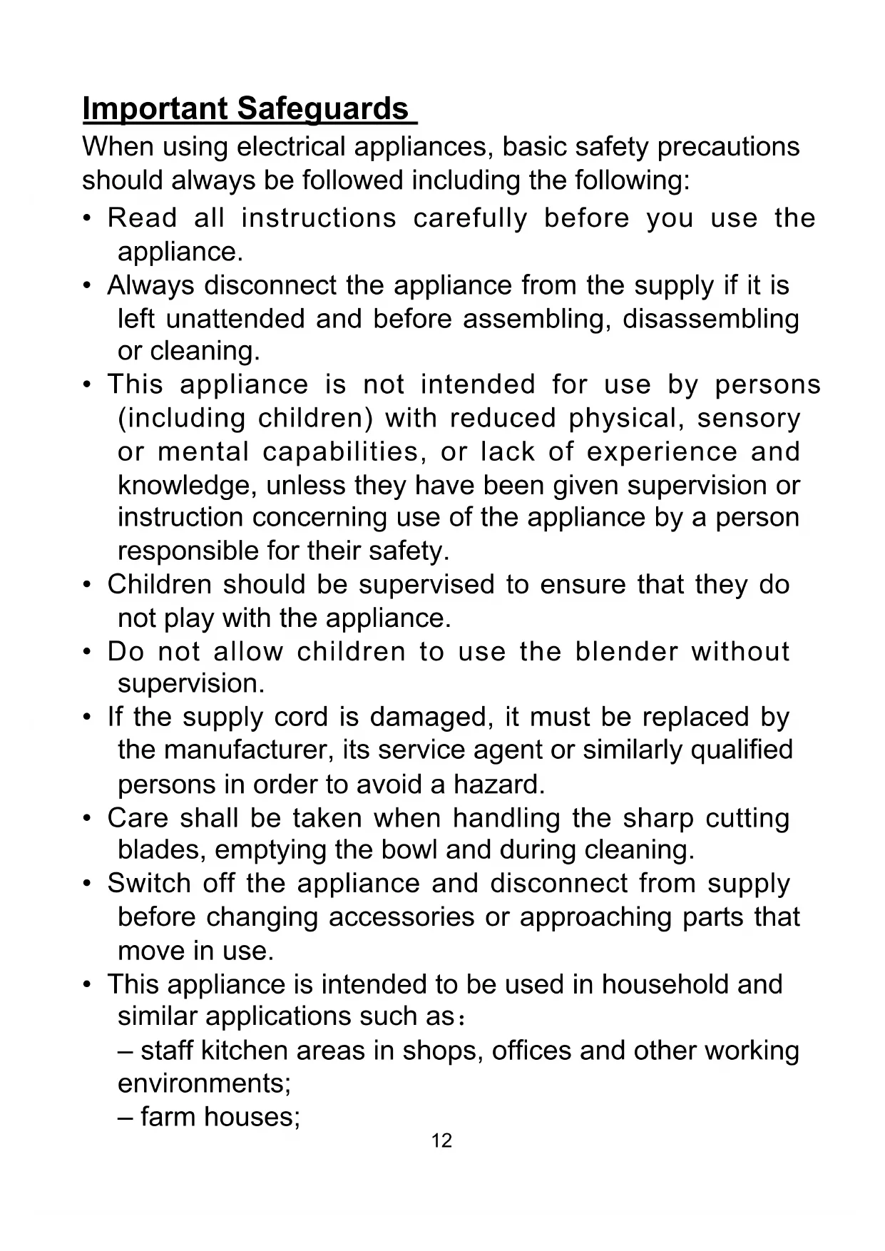- Never let the blades face toward anybody while operating the appliance.