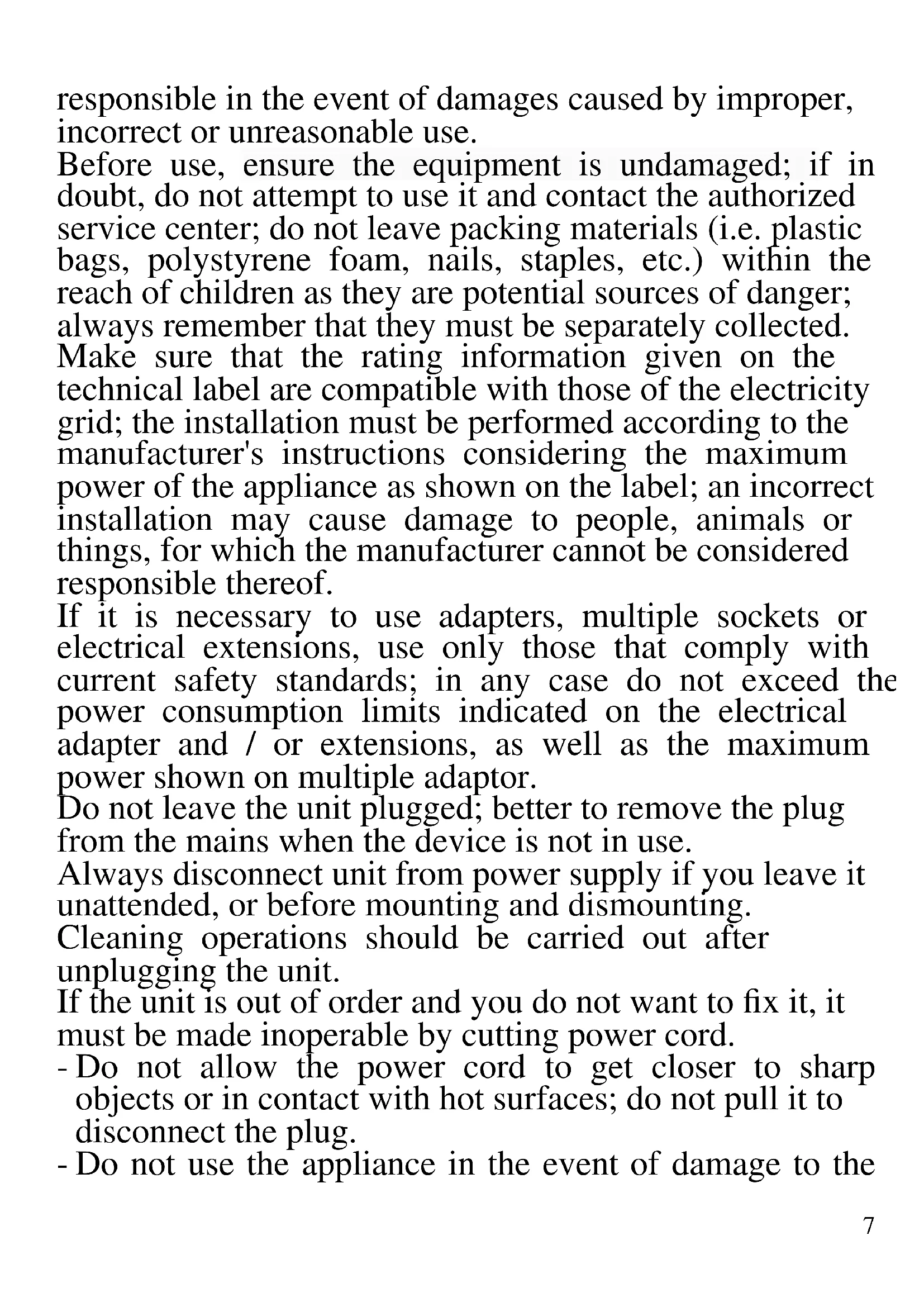 The following are important notes on the installation, use and maintenance; save this instruction manual for future reference; use the equipment only as specified in this guide; any other use is considered improper and dangerous; therefore, the manufacturer cannot be held7 responsible in the event of damages caused by improper, incorrect or unreasonable use. Before use, ensure the equipment is undamaged; if in doubt, do not attempt to use it and contact the authorized service center; do not leave packing materials (i.e. plastic bags, polystyrene foam, nails, staples, etc.) within the reach of children as they are potential sources of danger; always remember that they must be separately collected. Make sure that the rating information given on the technical label are compatible with those of the electricity grid; the installation must be performed according to the manufacturer's instructions considering the maximum power of the appliance as shown on the label; an incorrect installation may cause damage to people, animals or things, for which the manufacturer cannot be considered responsible thereof. If it is necessary to use adapters, multiple sockets or electrical extensions, use only those that comply with current safety standards; in any case do not exceed the power consumption limits indicated on the electrical adapter and / or extensions, as well as the maximum power shown on multiple adaptor. Do not leave the unit plugged; better to remove the plug from the mains when the device is not in use. Always disconnect unit from power supply if you leave it unattended, or before mounting and dismounting. Cleaning operations should be carried out after unplugging the unit. If the unit is out of order and you do not want to fix it, it must be made inoperable by cutting power cord. - Do not allow the power cord to get closer to sharp objects or in contact with hot surfaces; do not pull it to disconnect the plug. - Do not use the appliance in the event of damage to the8 power cord, plug, or in case of short circuits; to repair the product only address an authorized service center. - Do not handle or touch the appliance with wet hands or bare feet. Do not expose the appliance to harmful weather conditions such as rain, moisture, frost, etc.. Always store it in a dry place. - This appliance can be used by children of 8 years and above and persons with reduced physical, sensory or mental capabilities or lack of experience and knowledge if they received supervision or instruction concerning use of the appliance in a safe way and understand hazards involved; children shall not play with the appliance; cleaning and user maintenance shall not be made by children without supervision. - Children must not play with the appliance. - Keep the appliance and its cord out of reach of children less than 8 years. - Not for commercial use. Household use only In case of failure and / or malfunction do not tamper with the unit; to repair the appliance, always contact the service center authorized by the manufacturer and request the use of original spare parts; failure to comply with the above may compromise the unit safety and invalidate the warranty.