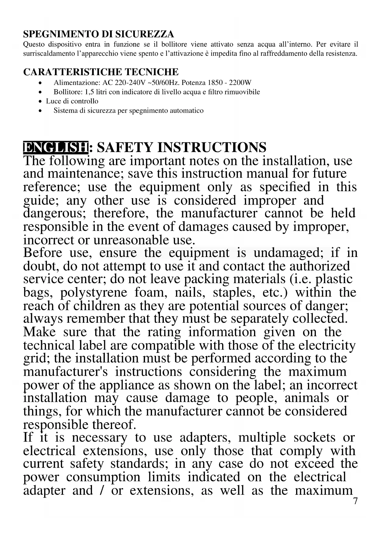 To prevent the formation of lime scale, it is recommended to make periodic special cleaning, following the instructions below: Pour water in the kettle until it reaches half the maximum capacity and add some lemon juice. Boil water mixed with lemon 3 times. Empty the kettle and rinse by boiling normal water for 2-3 times. SAFETY SWITCH-OFF The safety device is triggered if the kettle operates without water inside. To avoid overheating, the appliance is automatically turned off and cannot be activated until the complete cooling of the electric resistance. TECHNICAL FEATURES