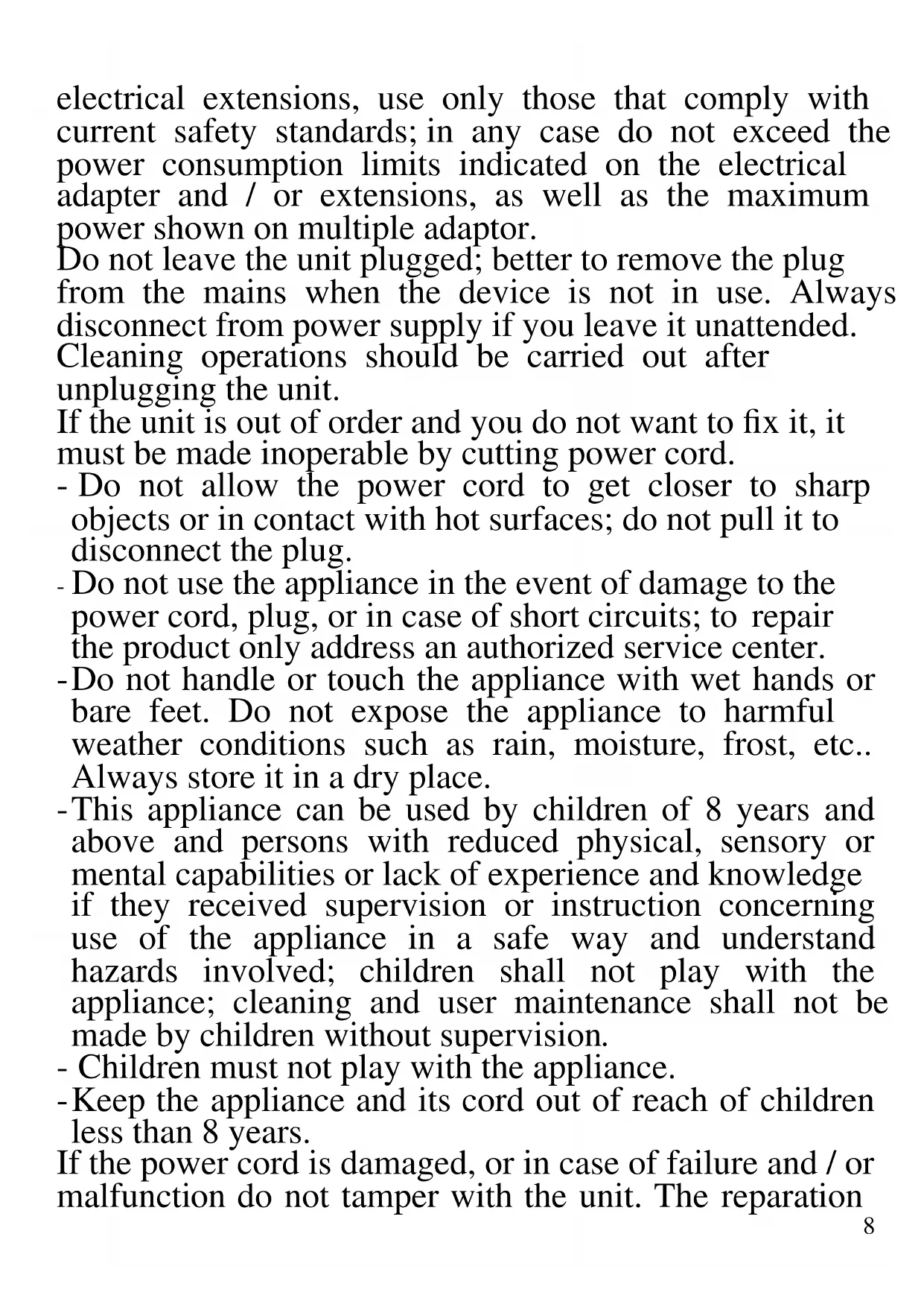 The following are important notes on the installation, use and maintenance; save this instruction manual for future reference; use the equipment only as specified in this guide; any other use is considered improper and dangerous; therefore, the manufacturer cannot be held responsible in the event of damages caused by improper, incorrect or unreasonable use. Before use, ensure the equipment is undamaged; if in doubt, do not attempt to use it and contact the authorized service center; do not leave packing materials (i.e. plastic bags, polystyrene foam, nails, staples, etc.) within the reach of children as they are potential sources of danger; always remember that they must be separately collected. Make sure that the rating information given on the technical label are compatible with those of the electricity grid; the installation must be performed according to the manufacturer's instructions considering the maximum power of the appliance as shown on the label; an incorrect installation may cause damage to people, animals or things, for which the manufacturer cannot be considered responsible thereof. If it is necessary to use adapters, multiple sockets or8 electrical extensions, use only those that comply with current safety standards; in any case do not exceed the power consumption limits indicated on the electrical adapter and / or extensions, as well as the maximum power shown on multiple adaptor. Do not leave the unit plugged; better to remove the plug from the mains when the device is not in use. Always disconnect from power supply if you leave it unattended. Cleaning operations should be carried out after unplugging the unit. If the unit is out of order and you do not want to fix it, it must be made inoperable by cutting power cord. - Do not allow the power cord to get closer to sharp objects or in contact with hot surfaces; do not pull it to disconnect the plug. - Do not use the appliance in the event of damage to the power cord, plug, or in case of short circuits; to repair the product only address an authorized service center. - Do not handle or touch the appliance with wet hands or bare feet. Do not expose the appliance to harmful weather conditions such as rain, moisture, frost, etc.. Always store it in a dry place. - This appliance can be used by children of 8 years and above and persons with reduced physical, sensory or mental capabilities or lack of experience and knowledge if they received supervision or instruction concerning use of the appliance in a safe way and understand hazards involved; children shall not play with the appliance; cleaning and user maintenance shall not be made by children without supervision. - Children must not play with the appliance. - Keep the appliance and its cord out of reach of children less than 8 years. If the power cord is damaged, or in case of failure and / or malfunction do not tamper with the unit. The reparation9 must be done by manufacturer or by service center authorized by the manufacturer in order to prevent any risk. Failure to comply with the above may compromise the unit safety and invalidate the warranty.
