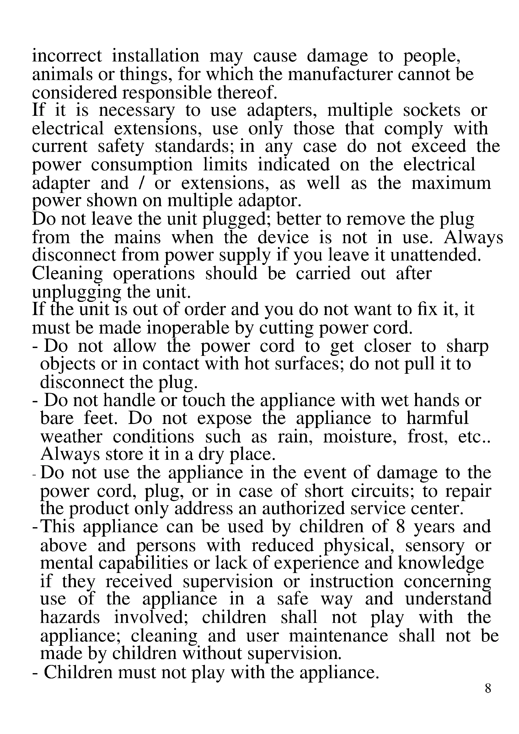 The following are important notes on the installation, use and maintenance; save this instruction manual for future reference; use the equipment only as specified in this guide; any other use is considered improper and dangerous; therefore, the manufacturer cannot be held responsible in the event of damages caused by improper, incorrect or unreasonable use. Before use, ensure the equipment is undamaged; if in doubt, do not attempt to use it and contact the authorized service center; do not leave packing materials (i.e. plastic bags, polystyrene foam, nails, staples, etc.) within the reach of children as they are potential sources of danger; always remember that they must be separately collected. Make sure that the rating information given on the technical label are compatible with those of the electricity grid; the installation must be performed according to the manufacturer's instructions considering the maximum power of the appliance as shown on the label; an8 incorrect installation may cause damage to people, animals or things, for which the manufacturer cannot be considered responsible thereof. If it is necessary to use adapters, multiple sockets or electrical extensions, use only those that comply with current safety standards; in any case do not exceed the power consumption limits indicated on the electrical adapter and / or extensions, as well as the maximum power shown on multiple adaptor. Do not leave the unit plugged; better to remove the plug from the mains when the device is not in use. Always disconnect from power supply if you leave it unattended. Cleaning operations should be carried out after unplugging the unit. If the unit is out of order and you do not want to fix it, it must be made inoperable by cutting power cord. - Do not allow the power cord to get closer to sharp objects or in contact with hot surfaces; do not pull it to disconnect the plug. - Do not handle or touch the appliance with wet hands or bare feet. Do not expose the appliance to harmful weather conditions such as rain, moisture, frost, etc.. Always store it in a dry place. - Do not use the appliance in the event of damage to the power cord, plug, or in case of short circuits; to repair the product only address an authorized service center. - This appliance can be used by children of 8 years and above and persons with reduced physical, sensory or mental capabilities or lack of experience and knowledge if they received supervision or instruction concerning use of the appliance in a safe way and understand hazards involved; children shall not play with the appliance; cleaning and user maintenance shall not be made by children without supervision. - Children must not play with the appliance.9 - Keep the appliance and its cord out of reach of children less than 8 years. If the power cord is damaged, or in case of failure and / or malfunction do not tamper with the unit. The reparation must be done by manufacturer or by service center authorized by the manufacturer in order to prevent any risk. Failure to comply with the above may compromise the unit safety and invalidate the warranty.