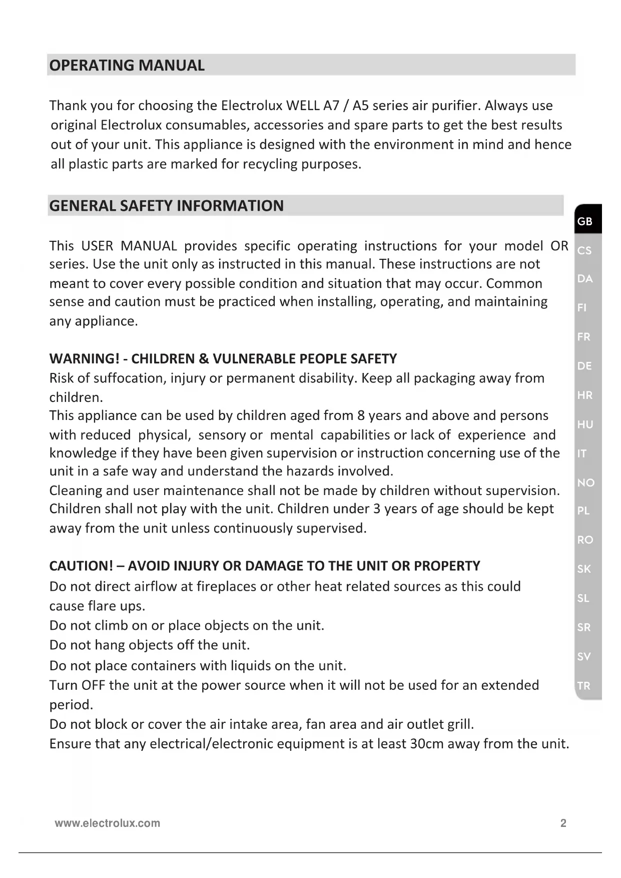 Models: WA51-303 & WA51-304 series WA71-304 & WA71-305 series Instruction book Mode d’emploiOPERATING MANUAL Thank you for choosing the Electrolux WELL A7 / A5 series air purifier. Always use original Electrolux consumables, accessories and spare parts to get the best results out of your unit. This appliance is designed with the environment in mind and hence all plastic parts are marked for recycling purposes.