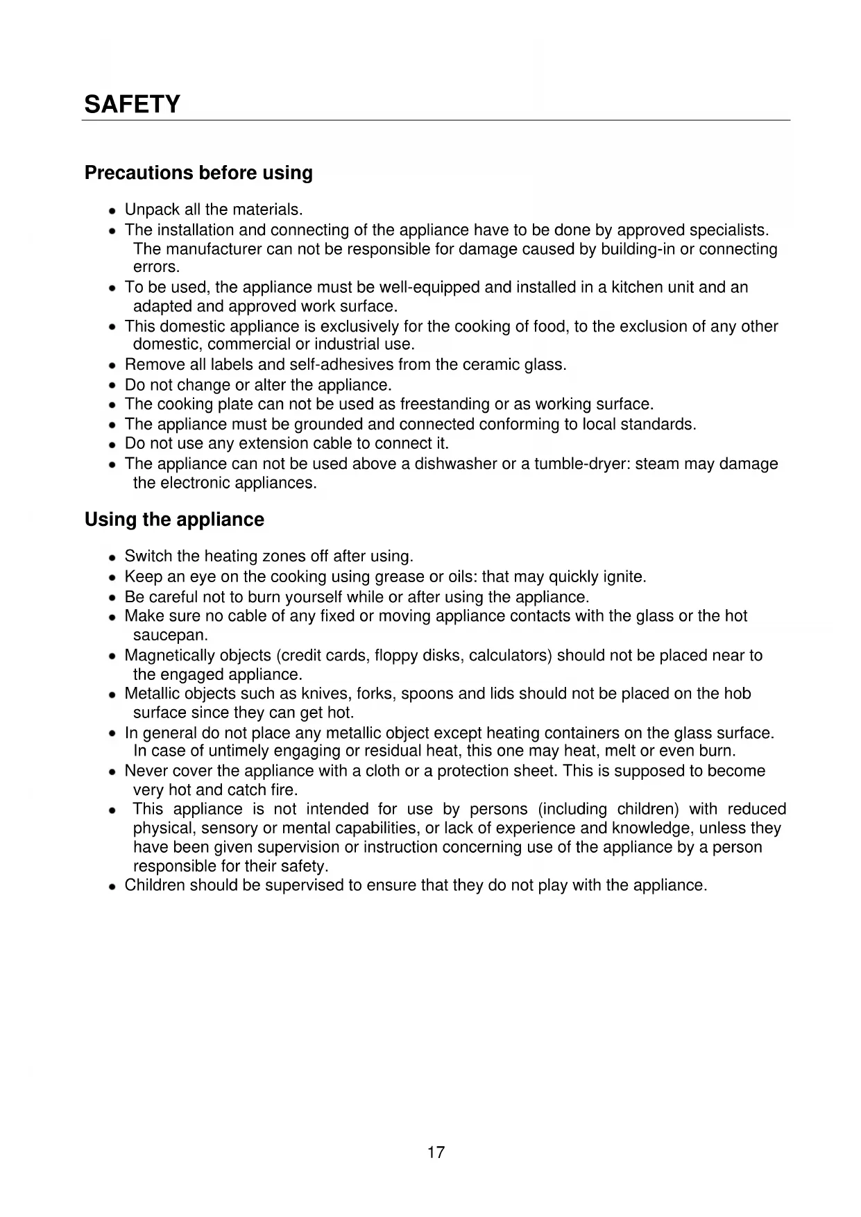 - ELECTRICAL CONNECTION SAFETY Precautions before using Unpack all the materials. The installation and connecting of the appliance have to be done by approved specialists. The manufacturer can not be responsible for damage caused by building-in or connecting errors. To be used, the appliance must be well-equipped and installed in a kitchen unit and an adapted and approved work surface. This domestic appliance is exclusively for the cooking of food, to the exclusion of any other domestic, commercial or industrial use. Remove all labels and self-adhesives from the ceramic glass. Do not change or alter the appliance. The cooking plate can not be used as freestanding or as working surface. The appliance must be grounded and connected conforming to local standards. Do not use any extension cable to connect it. The appliance can not be used above a dishwasher or a tumble-dryer: steam may damage the electronic appliances. Using the appliance Switch the heating zones off after using. Keep an eye on the cooking using grease or oils: that may quickly ignite. Be careful not to burn yourself while or after using the appliance. Make sure no cable of any fixed or moving appliance contacts with the glass or the hot saucepan. Magnetically objects (credit cards, floppy disks, calculators) should not be placed near to the engaged appliance. Metallic objects such as knives, forks, spoons and lids should not be placed on the hob surface since they can get hot. In general do not place any metallic object except heating containers on the glass surface. In case of untimely engaging or residual heat, this one may heat, melt or even burn. Never cover the appliance with a cloth or a protection sheet. This is supposed to become very hot and catch fire. This appliance is not intended for use by persons (including children) with reduced physical, sensory or mental capabilities, or lack of experience and knowledge, unless they have been given supervision or instruction concerning use of the appliance by a person responsible for their safety. Children should be supervised to ensure that they do not play with the appliance.18 Precautions not to damage the appliance Raw pan bottoms or damaged saucepans (not enamelled cast iron pots,) may damage the ceramic glass. Sand or other abrasive materials may damage ceramic glass. Avoid dropping objects, even little ones, on the vitroceramic. Do not hit the edges of the glass with saucepans. Make sure that the ventilation of the appliance works according to the manufacturer’s instructions. Do not put or leave empty saucepans on the vitroceramic hobs. Sugar, synthetic materials or aluminium sheets must not contact with the heating zones. These may cause breaks or other alterations of the vitroceramic glass by cooling: switch on the appliance and take them immediately out of the hot heating zone (be careful: do not burn yourself). Never place any hot container over the control panel. If a drawer is situated under the embedded appliance, make sure the space between the content of the drawer and the inferior part of the appliance is large enough (2 cm). This is essential to guaranty a correct ventilation. Never put any inflammable object (ex. sprays) into the drawer situated under the vitroceramic hob. The eventual cutlery drawers must be resistant to heat. Precautions in case of appliance failure If a defect is noticed, switch on the appliance and turn off the electrical supplying. If the ceramic glass is cracked or fissured, you must unplug the appliance and contact the after sales service. Repairing has to be done by specialists. Do not open the appliance by yourself. p. 2817
