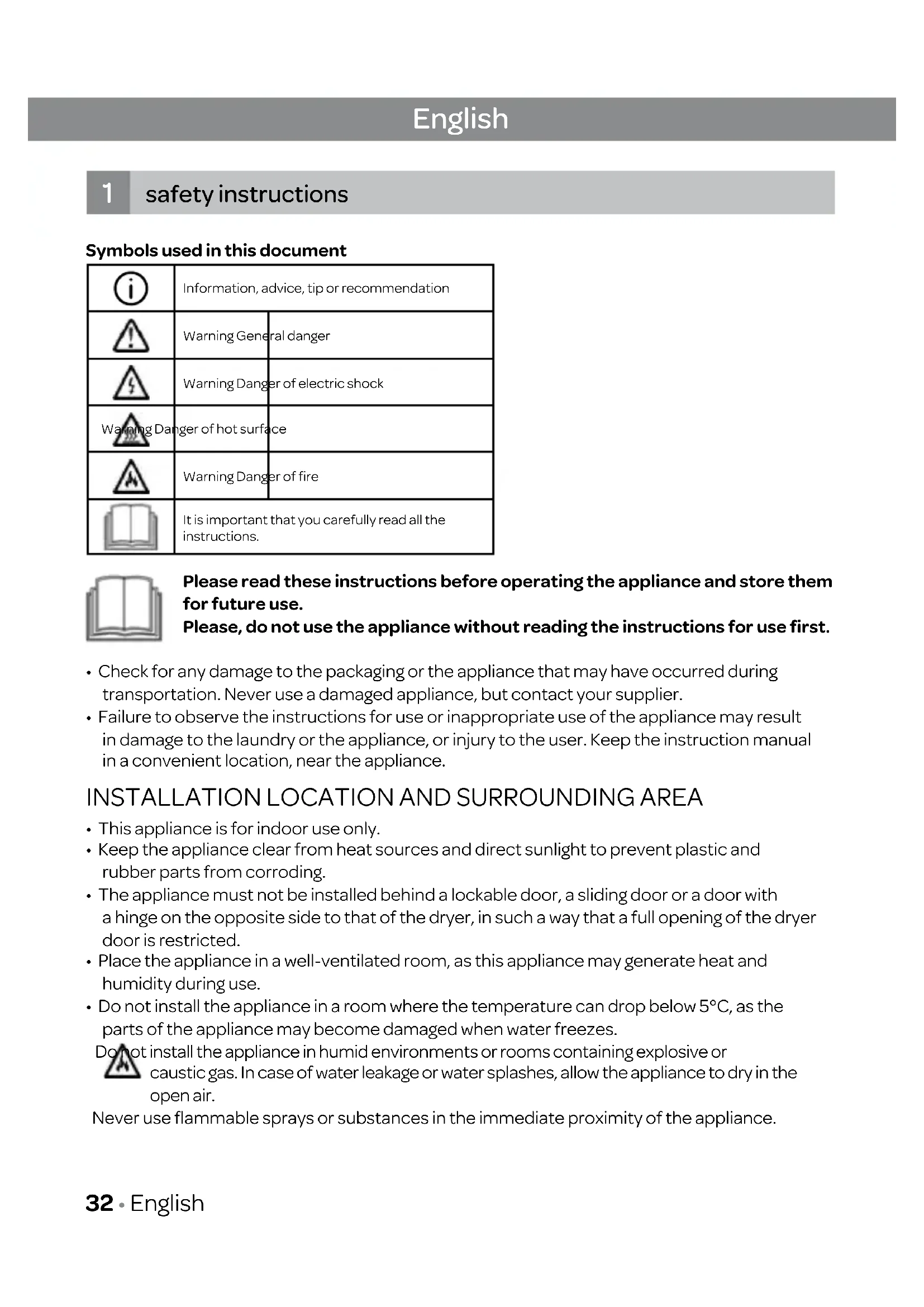 - Do not install the appliance in a room where the temperature can drop below 5°C, as the parts of the appliance may become damaged when water freezes. Do not install the appliance in humid environments or rooms containing explosive or caustic gas. Incase of water leakage or water splashes, allow the appliance to dry in the open air. Never use flammable sprays or substances in the immediate proximity of the appliance. 32 • EnglishINSTALLATION