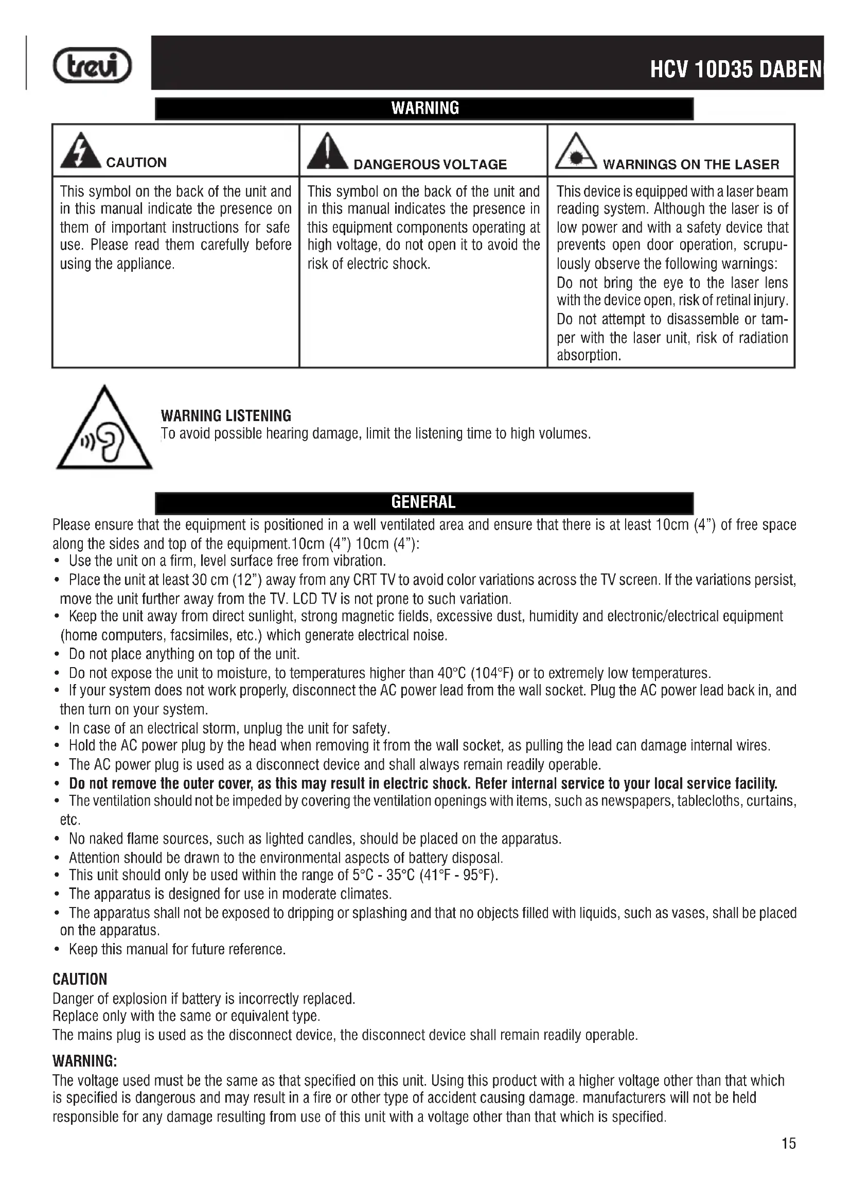 This symbol on the back of the unit and in this manual indicate the presence on them of important instructions for safe use. Please read them carefully before using the appliance. This symbol on the back of the unit and in this manual indicates the presence in this equipment components operating at high voltage, do not open it to avoid the risk of electric shock. This device is equipped with a laser beam reading system. Although the laser is of low power and with a safety device that prevents open door operation, scrupu- lously observe the following warnings: Do not bring the eye to the laser lens with the device open, risk of retinal injury. Do not attempt to disassemble or tam- per with the laser unit, risk of radiation absorption. WARNING LISTENING To avoid possible hearing damage, limit the listening time to high volumes.16