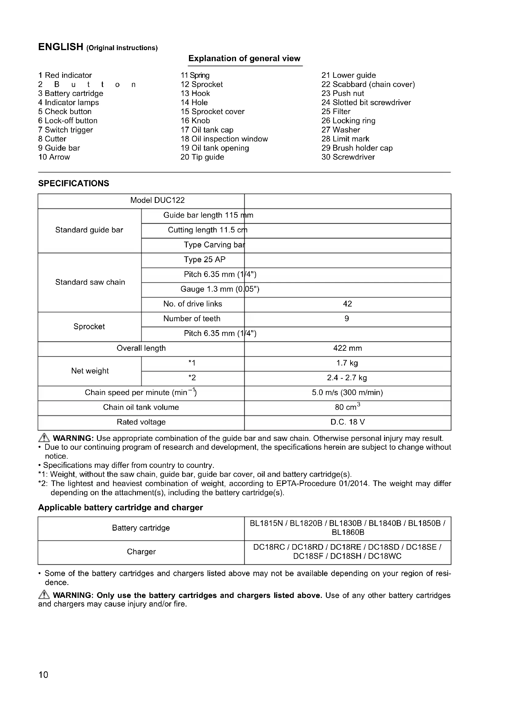 and chargers may cause injury and/or fire. Model DUC122 Standard guide bar Guide bar length 115 mm Cutting length 11.5 cm Type Carving bar Standard saw chain Type 25 AP Pitch 6.35 mm (1/4") Gauge 1.3 mm (0.05") No. of drive links 42 Sprocket Number of teeth 9 Pitch 6.35 mm (1/4") Overall length 422 mm Net weight *1 1.7 kg *2 2.4 - 2.7 kg Chain speed per minute (min