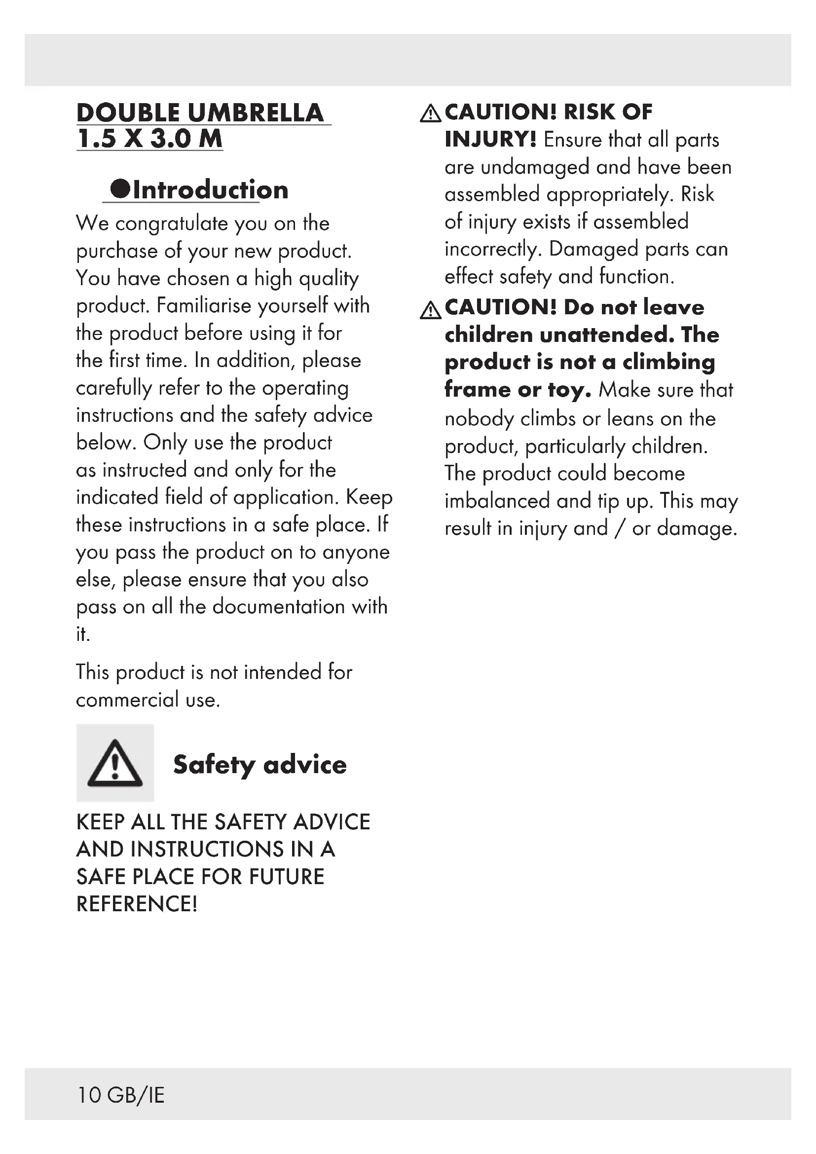 CAUTION! Do not leave children unattended. The product is not a climbing frame or toy. Make sure that nobody climbs or leans on the product, particularly children. The product could become imbalanced and tip up. This may result in injury and/ or damage.11 GB/IE