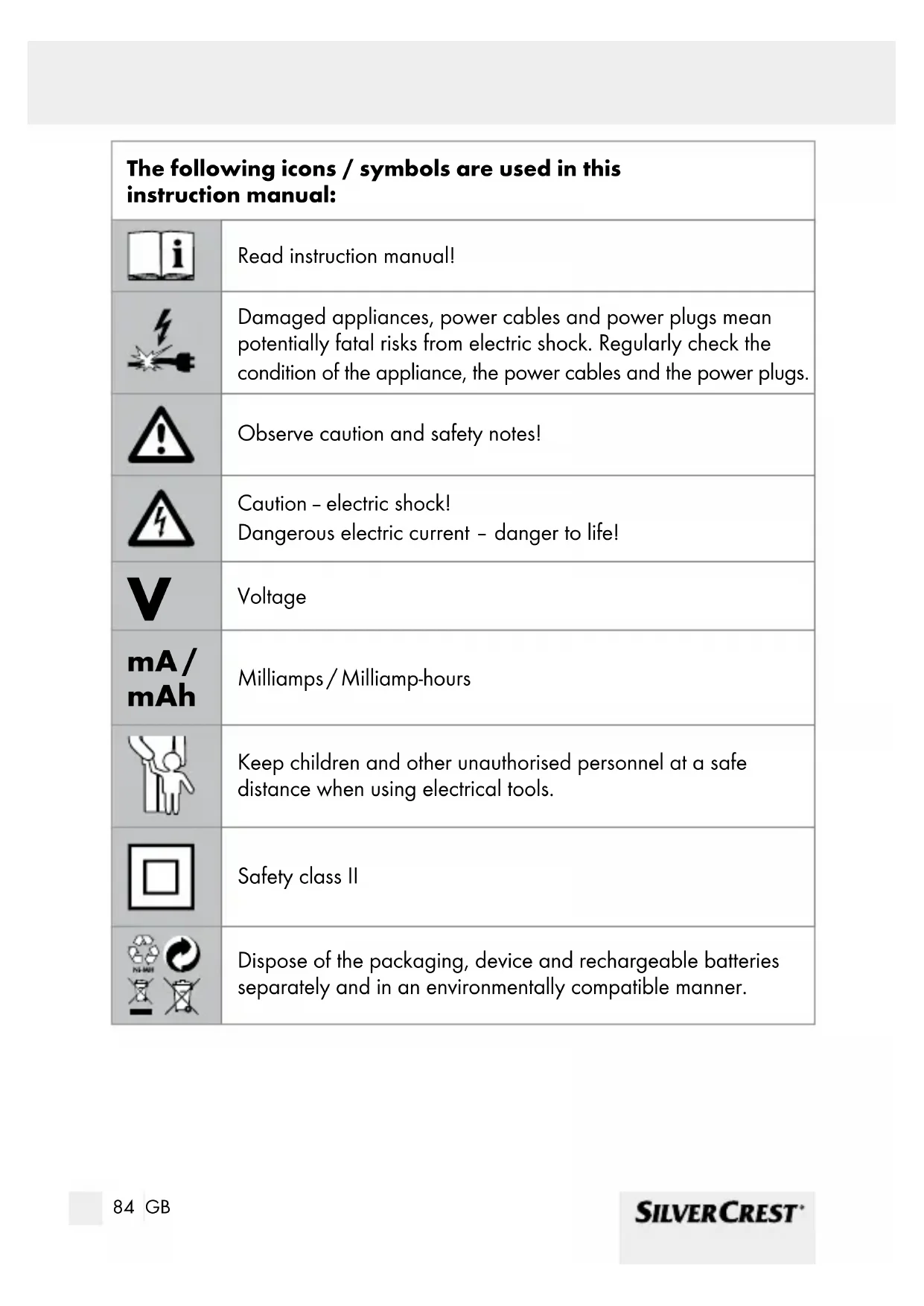 Voltage mA / mAh Milliamps / Milliamp-hours Keep children and other unauthorised personnel at a safe distance when using electrical tools. Safety class II Dispose of the packaging, device and rechargeable batteries separately and in an environmentally compatible manner.85 GB Introduction Hair & Beard Clippers SHBS 1000 A1