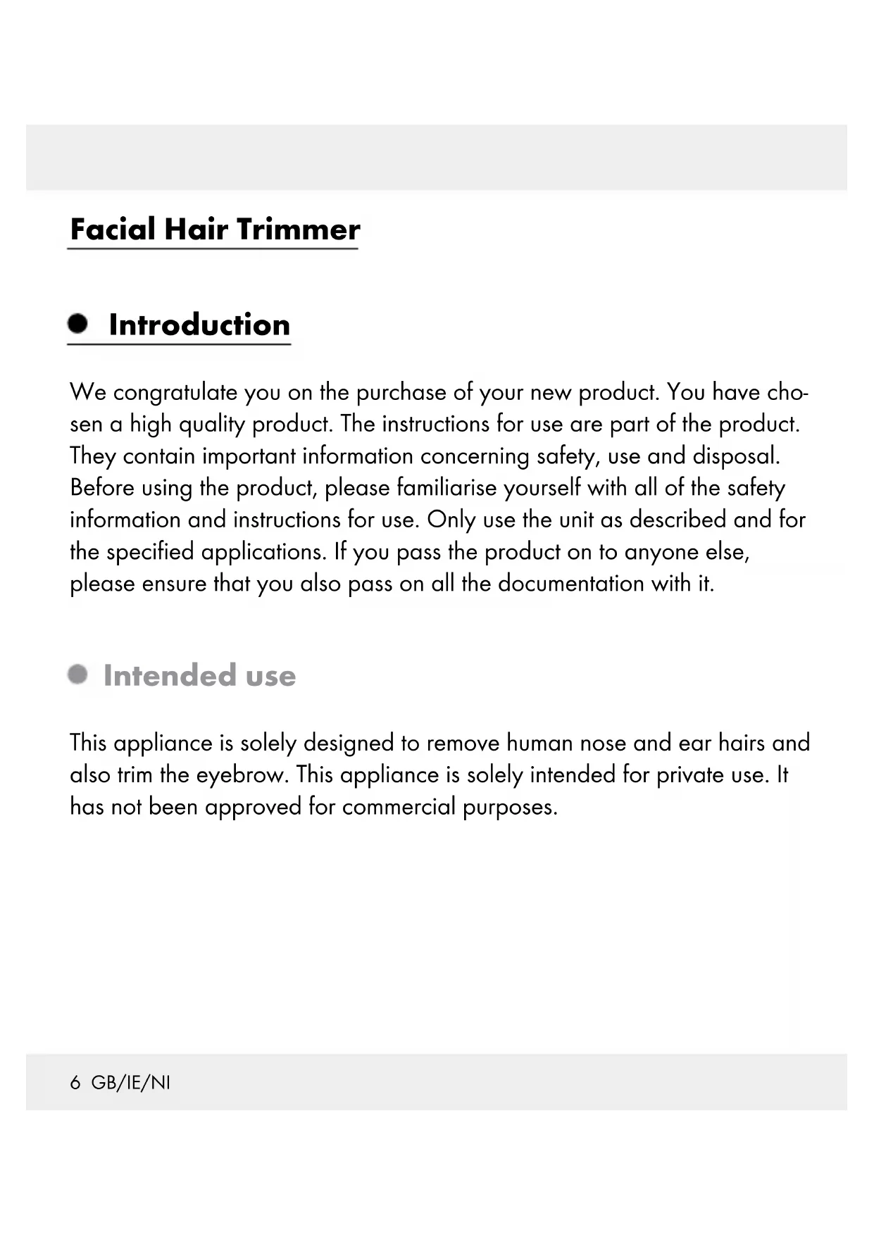 Battery Technical data Battery: 1.5 V battery (AA) Degree of protection: IPX4 (splash-proof) Emissions Sound pressure level: < 72 dB(A), K = 3 dB(A) Included items 1 Nose & ear hair trimmer 1 Battery 1.5 V / AA 1 Cleaning brush 1 Long comb attachment 1 Short comb attachment 1 Instructions for use8 GB/IE/NI Safety instructions KEEP ALL THE SAFETY ADVICE AND INSTRUC- TIONS IN A SAFE PLACE FOR FUTURE REFER- ENCE! CAUTION! This product is not a toy for children! Keep out of the reach of children. Children are not aware of the dangers associated with handling electrical products. This appliance can be used by children aged from 8 years and above and persons with reduced physical, sensory or mental capabilities or lack of experience and knowledge if they have been given supervision or instruction concerning use of the appliance in a safe way and understand the hazards involved. Children shall not play with the appliance. Cleaning and user mainte-9 GB/IE/NI nance shall not be made by children without supervision. Do not use the product if you notice any signs of damage, otherwise you may get hurt. Do not expose the product to high temperatures or moisture, otherwise the product may be damaged. Prevent strong impact or stress on the product to avoid damages! In the event of damage, repairs or other problems with the device, please contact an electrician. Keep the appliance dry. Never immerse this appliance into water. Safety advice concerning batteries DANGER TO LIFE! Batteries are not intended to be in the hands of children.10 GB/IE/NI Do not leave batteries lying around. They could be swallowed by children or pets. In the event of swallowing a battery, contact a doctor immediately. FIRE HAZARD! Do not allow the battery to short-circuit. Overheating, fire or bursting of the batteries might result. Never throw batteries into fire or water. Never attempt to recharge single-use bat- teries! The batteries might explode. Spent or damaged batteries may irritate the skin on contact; so always wear suitable protective gloves in these circumstances. Remove used batteries from the device. Very old or used batteries may leak. The chemical fluid can damage the product. Remove the battery from the device if it will not be used for a prolonged period. Check the battery regularly for leaks.11 GB/IE/NI Preparing the product for use Inserting / replacing the battery To insert / replace the battery