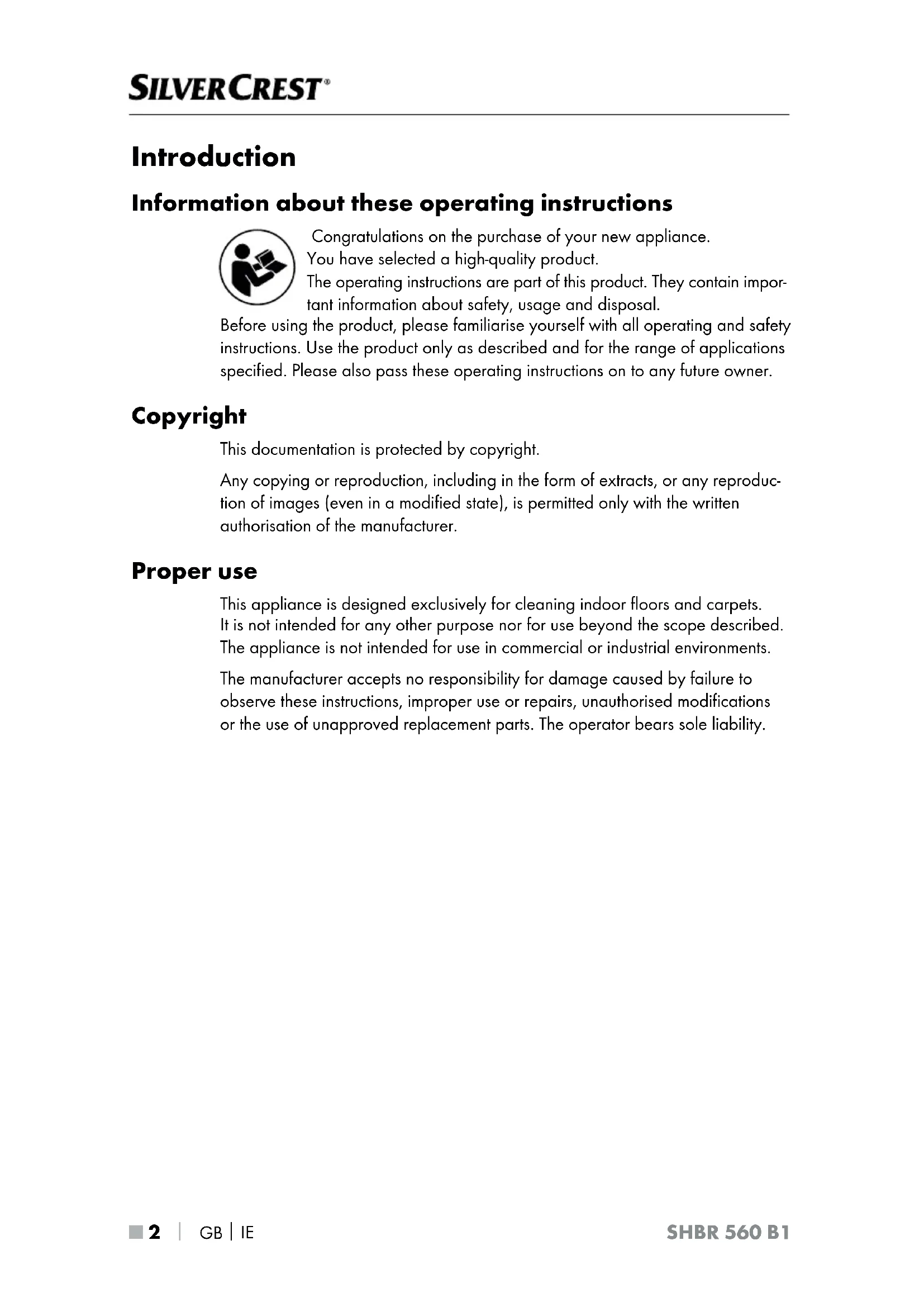 SHBR 560 B1 Introduction Information about these operating instructions Congratulations on the purchase of your new appliance. You have selected a high-quality product. The operating instructions are part of this product. They contain impor- tant information about safety, usage and disposal. Before using the product, please familiarise yourself with all operating and safety instructions. Use the product only as described and for the range of applications specified. Please also pass these operating instructions on to any future owner. Copyright This documentation is protected by copyright. Any copying or reproduction, including in the form of extracts, or any reproduc- tion of images (even in a modified state), is permitted only with the written authorisation of the manufacturer. Proper use This appliance is designed exclusively for cleaning indoor floors and carpets. It is not intended for any other purpose nor for use beyond the scope described. The appliance is not intended for use in commercial or industrial environments. The manufacturer accepts no responsibility for damage caused by failure to observe these instructions, improper use or repairs, unauthorised modifications or the use of unapproved replacement parts. The operator bears sole liability.GB