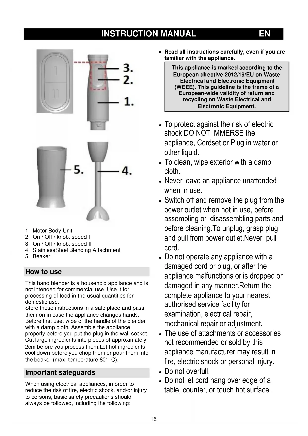 How to use This hand blender is a household appliance and is not intended for commercial use. Use it for processing of food in the usual quantities for domestic use. Store these instructions in a safe place and pass them on in case the appliance changes hands. Before first use, wipe of the handle of the blender with a damp cloth. Assemble the appliance properly before you put the plug in the wall socket. Cut large ingredients into pieces of approximately 2cm before you process them.Let hot ingredients cool down before you chop them or pour them into the beaker (max. temperature 80°C). Important safeguards When using electrical appliances, in order to reduce the risk of fire, electric shock, and/or injury to persons, basic safety precautions should always be followed, including the following: