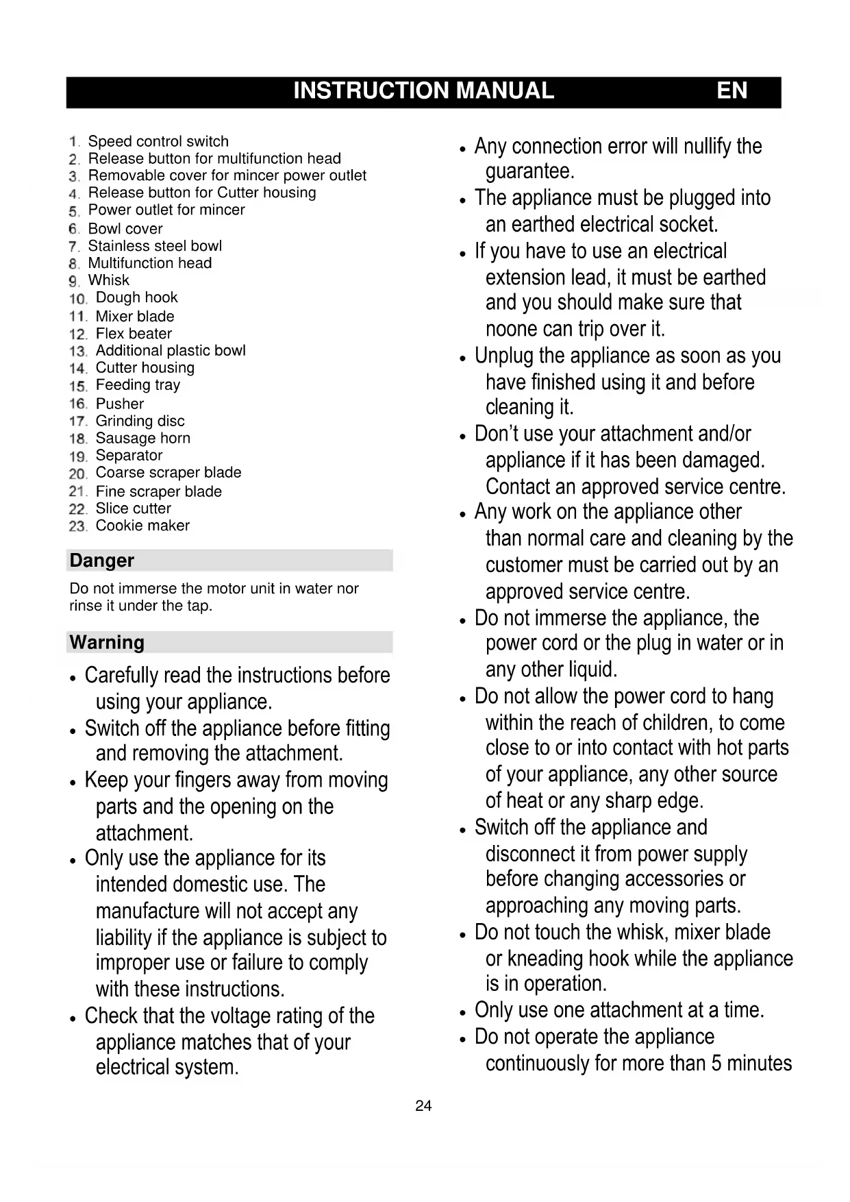 Speed control switch Release button for multifunction head Removable cover for mincer power outlet Release button for Cutter housing Power outlet for mincer Bowl cover Stainless steel bowl Multifunction head Whisk Dough hook Mixer blade Flex beater Additional plastic bowl Cutter housing Feeding tray Pusher Grinding disc Sausage horn Separator Coarse scraper blade Fine scraper blade Slice cutter Cookie maker Danger Do not immerse the motor unit in water nor rinse it under the tap. Warning