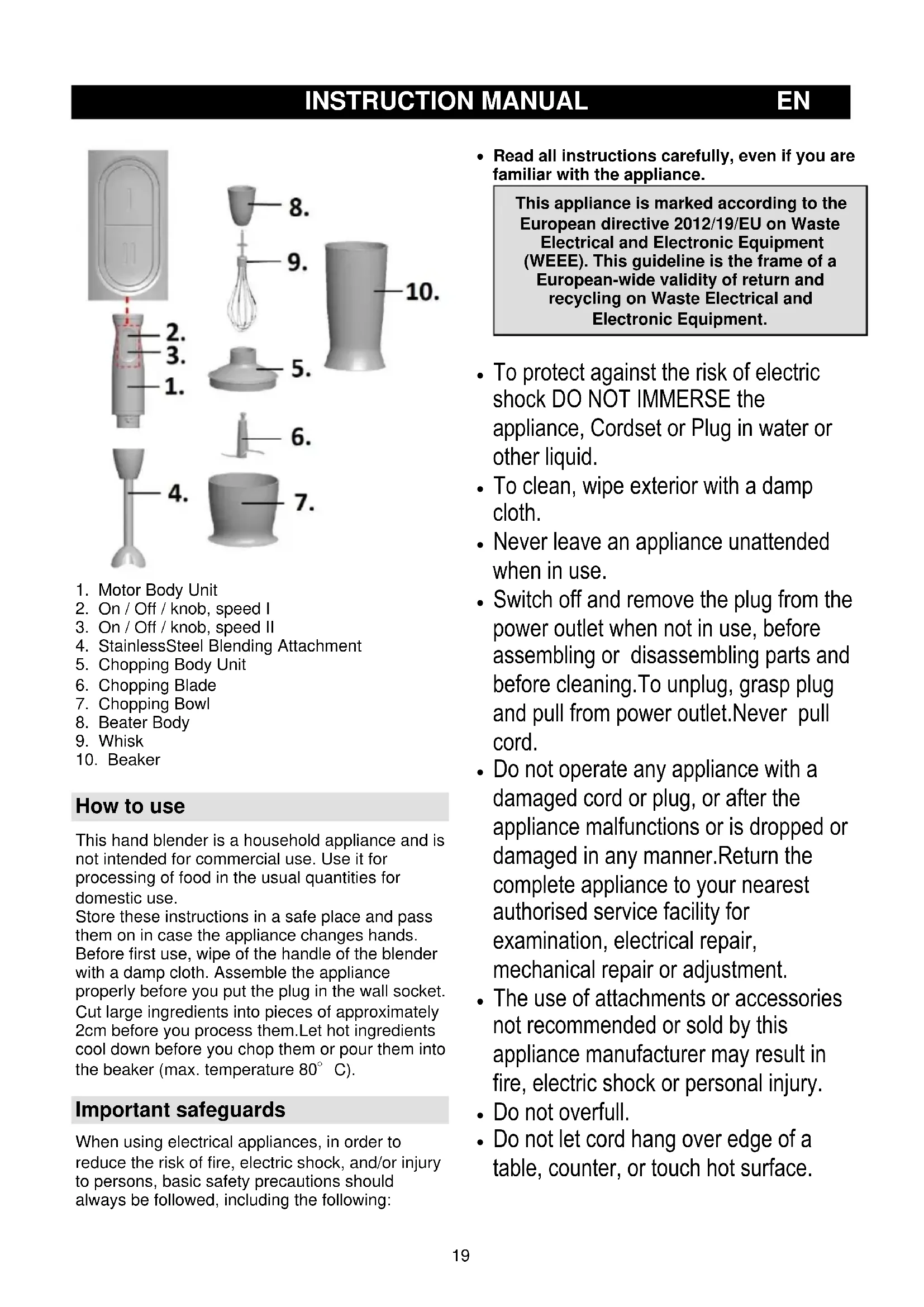 How to use This hand blender is a household appliance and is not intended for commercial use. Use it for processing of food in the usual quantities for domestic use. Store these instructions in a safe place and pass them on in case the appliance changes hands. Before first use, wipe of the handle of the blender with a damp cloth. Assemble the appliance properly before you put the plug in the wall socket. Cut large ingredients into pieces of approximately 2cm before you process them.Let hot ingredients cool down before you chop them or pour them into the beaker (max. temperature 80°C). Important safeguards When using electrical appliances, in order to reduce the risk of fire, electric shock, and/or injury to persons, basic safety precautions should always be followed, including the following: