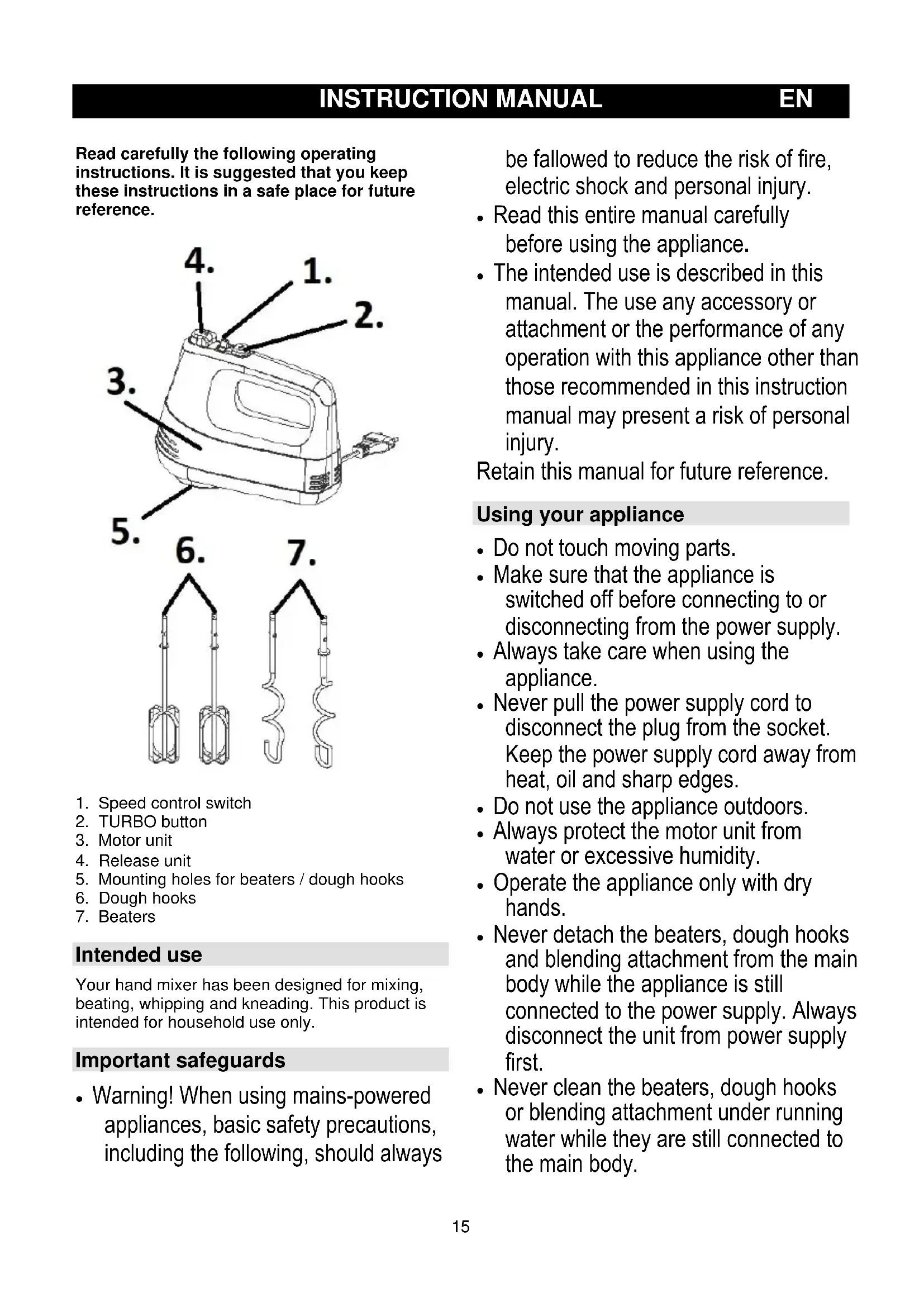 Intended use Your hand mixer has been designed for mixing, beating, whipping and kneading. This product is intended for household use only. Important safeguards