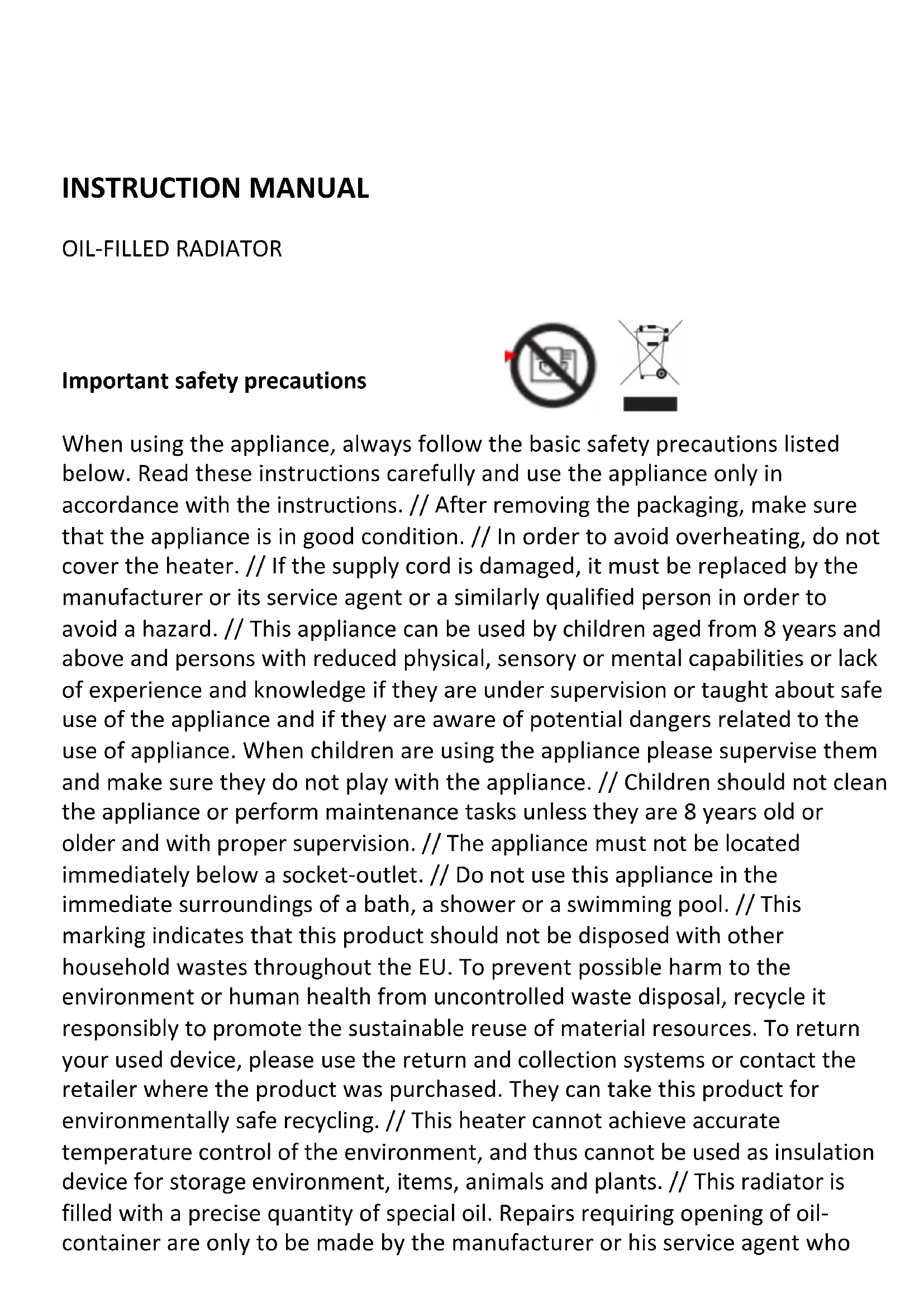 РЕЊЕ ВИ ПОСАКУВА МНОГУ ЗАДОВОЛСТВО ВО ТЕКОТ НА КОРИСТЕЊЕТО НА ВАШИОТ РАДИЈАТОР!INSTRUCTION MANUAL OIL-FILLED RADIATOR Important safety precautions When using the appliance, always follow the basic safety precautions listed below. Read these instructions carefully and use the appliance only in accordance with the instructions. // After removing the packaging, make sure that the appliance is in good condition. // In order to avoid overheating, do not cover the heater. // If the supply cord is damaged, it must be replaced by the manufacturer or its service agent or a similarly qualified person in order to avoid a hazard. // This appliance can be used by children aged from 8 years and above and persons with reduced physical, sensory or mental capabilities or lack of experience and knowledge if they are under supervision or taught about safe use of the appliance and if they are aware of potential dangers related to the use of appliance. When children are using the appliance please supervise them and make sure they do not play with the appliance. // Children should not clean the appliance or perform maintenance tasks unless they are 8 years old or older and with proper supervision. // The appliance must not be located immediately below a socket-outlet. // Do not use this appliance in the immediate surroundings of a bath, a shower or a swimming pool. // This marking indicates that this product should not be disposed with other household wastes throughout the EU. To prevent possible harm to the environment or human health from uncontrolled waste disposal, recycle it responsibly to promote the sustainable reuse of material resources. To return your used device, please use the return and collection systems or contact the retailer where the product was purchased. They can take this product for environmentally safe recycling. // This heater cannot achieve accurate temperature control of the environment, and thus cannot be used as insulation device for storage environment, items, animals and plants. // This radiator is filled with a precise quantity of special oil. Repairs requiring opening of oil- container are only to be made by the manufacturer or his service agent whoshould be contacted if there is an oil leak. When scrapping the appliance, follow the regulations concerning the disposal of oil. // 10. This heater cannot achieve accurate temperature control of the environment, and thus cannot be used as insulation device for storage environment, items, animals and plants. // The appliance is intended for domestic use only. Caution Fire risk exists if the heater is covered by or positioned close to curtains or other combustible materials. // Some parts of this product can become very hot and cause burns. Particular attention must be given where children and vulnerable people are present.PART FIGURE (OR2000M)
