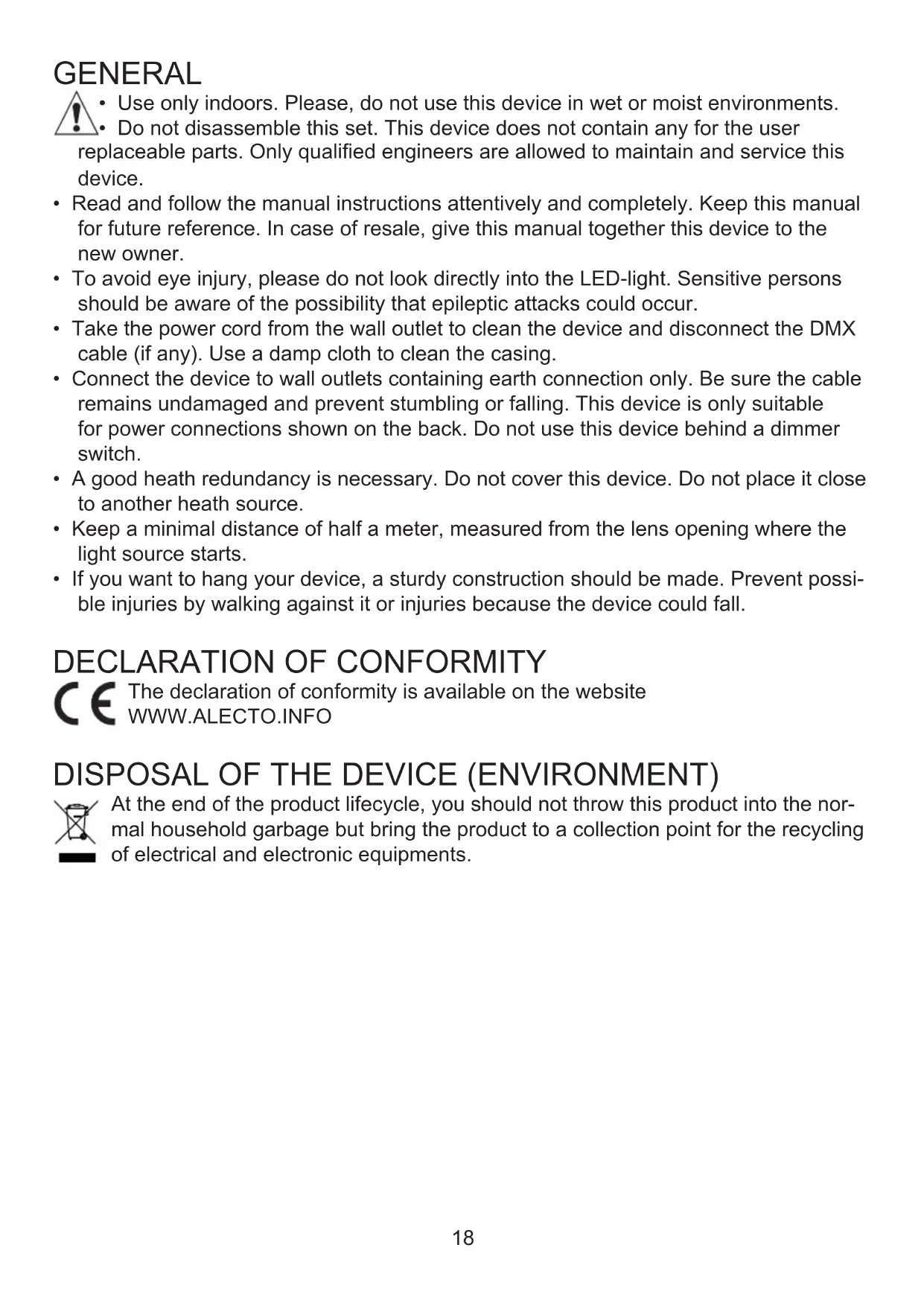 DISPOSAL OF THE DEVICE (ENVIRONMENT) At the end of the product lifecycle, you should not throw this product into the nor- mal household garbage but bring the product to a collection point for the recycling of electrical and electronic equipments.19