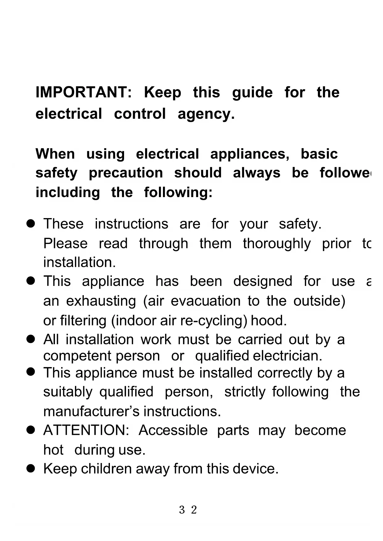 These instructions are for your safety. Please read through them thoroughly prior to installation. This appliance has been designed for use as an exhausting (air evacuation to the outside) or filtering (indoor air re-cycling) hood. All installation work must be carried out by a competent person or qualified electrician.
