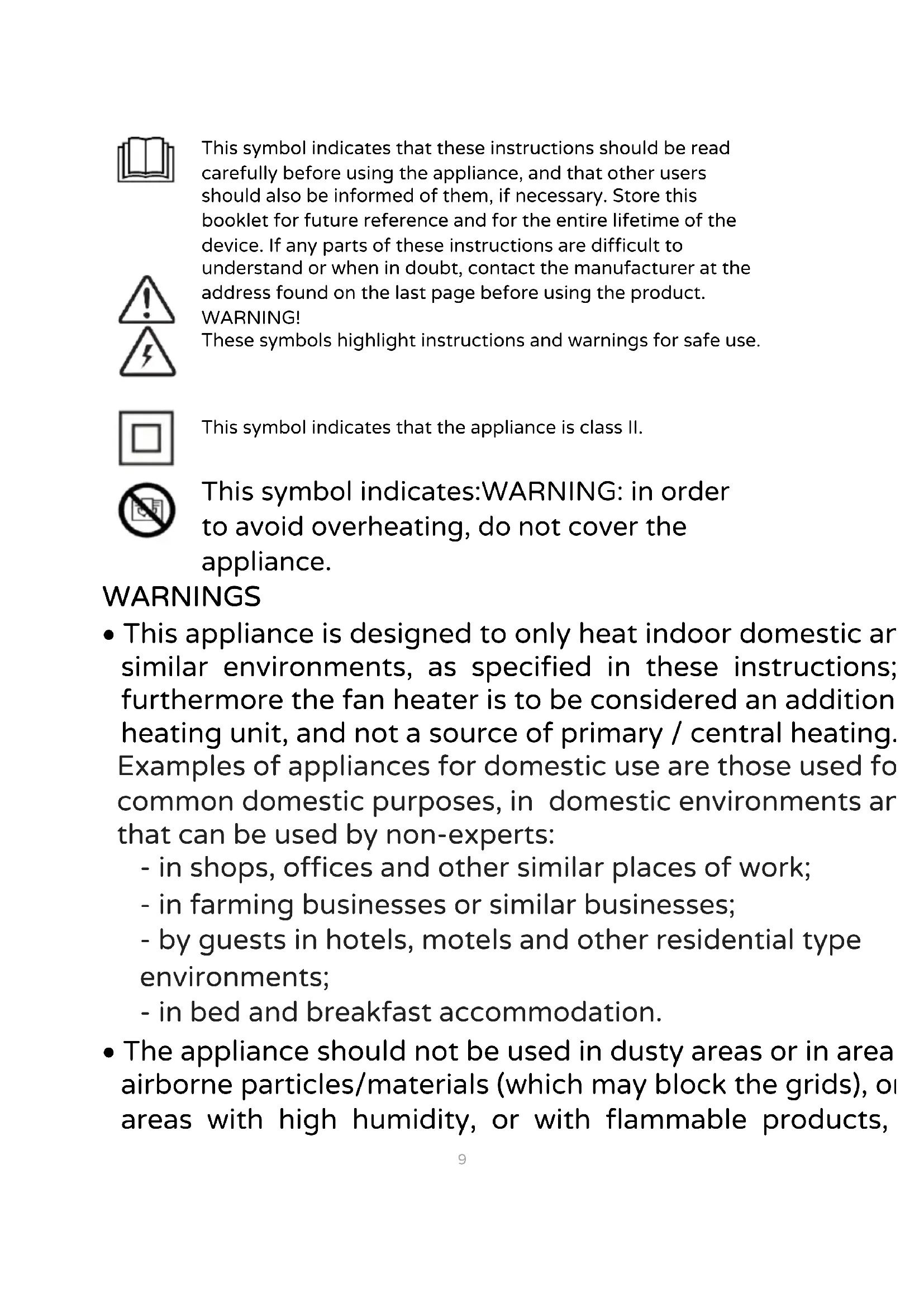 This symbol indicates that the appliance is class II. This symbol indicates:WARNING: in order to avoid overheating, do not cover the appliance.10 outdoors. Any other use should be considered inappropriate and dangerous. The manufacturer cannot be held responsible for any damages caused by improper, incorrect or irresponsible use and/or by repairs done by an unqualified person. The fan heaters gets hot when in use. Only touch the plastic handle and knobs. Avoid touching the grid since it becomes very hot. Do not insert fingers and/or any object through the front grid, in order to prevent abrasions, electric shocks or damage to the appliance. The grille does not provide complete protection to children or to people with reduced physical, sensory or mental capacity. WARNING! - Parts of this product can become hot and cause burns. Special care should be taken in the presence of children and vulnerable people. - when using electrical appliances, always adhere to basic safety precautions to prevent the risk of fire, electric shocks and physical injury. - Do not use this appliance in a room with an area of less than 4m². The appliance can be used by children over 8 and by people whose physical, mental or emotional capacity is limited or compromised, or who lack the appropriate experience or knowledge, only if they are supervised after receiving instructions about safe use of the appliance and they understand the hazards. Children must not play with the appliance. Cleaning and maintenance that must be carried out11 by the user must not be done by children unless they are supervised. Children younger than 3 years of age must be kept away from the appliance unless they are being constantly supervised. Children between the ages of 3 and 8 years should only turn on / off the appliance as long as it has been placed or installed in its normal operating position, and as long as they are supervised or receive instructions concerning the safe use of the appliance and understand the hazards involved. Children between the ages of 3 and 8 years should not plug it in, adjust or clean the appliance or perform user maintenance. Make sure the fan heater does not come into contact with water or any other liquid. If water or any other liquid comes into contact with the appliance, first turn off the power by switching it off at the distribution board, and only then remove the plug from the socket. Carefully dry both the plug and the socket before restoring power. Plug into the mains and then continue using the appliance. If in doubt consult a qualified professional.