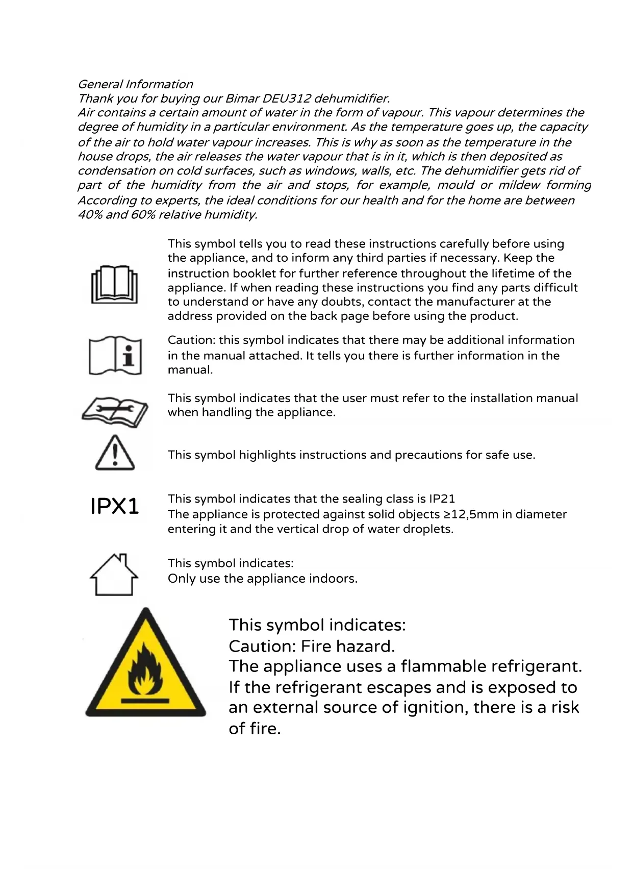 This symbol indicates: Caution: Fire hazard. The appliance uses a flammable refrigerant. If the refrigerant escapes and is exposed to an external source of ignition, there is a risk of fire.GENERAL WARNINGS This appliance is intended for domestic use only (therefore, it is not suitable for professional use), to dehumidify, i.e. reduce the percentage of relative humidity in indoor environments, in the manner reported in this manual. Do not use the appliance outdoors, or in particularly dusty environments, or in the presence of extremely volatile materials which could clog the filter or damage the motor. Examples of household appliances are appliances for typical household functions, those used in the home, or those which may be used for typical household functions even by untrained persons: - in shops, offices and other similar workplaces; - on farms and in similar locations; - by the customers of hotels, motels and other residential environments; - in bed and breakfast establishments. The appliance has been designed to work at temperatures between 5°C and 32°C. Only use the dehumidifier if all the components are correctly inserted. Always use the dehumidifier in an upright position only; do not sit or stand on the unit.
