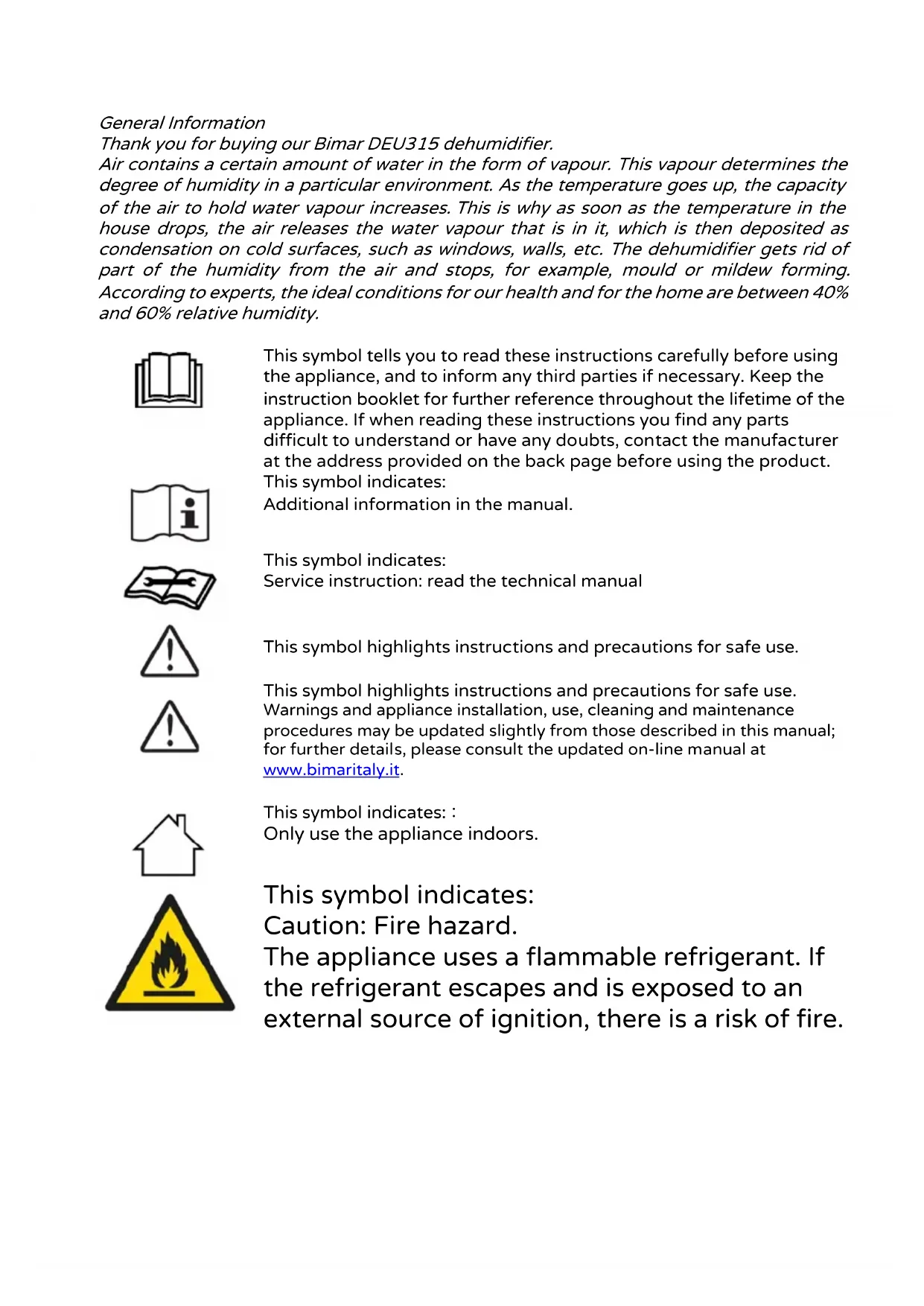 This symbol highlights instructions and precautions for safe use. This symbol highlights instructions and precautions for safe use. Warnings and appliance installation, use, cleaning and maintenance procedures may be updated slightly from those described in this manual; for further details, please consult the updated on-line manual at www.bimaritaly.it.
