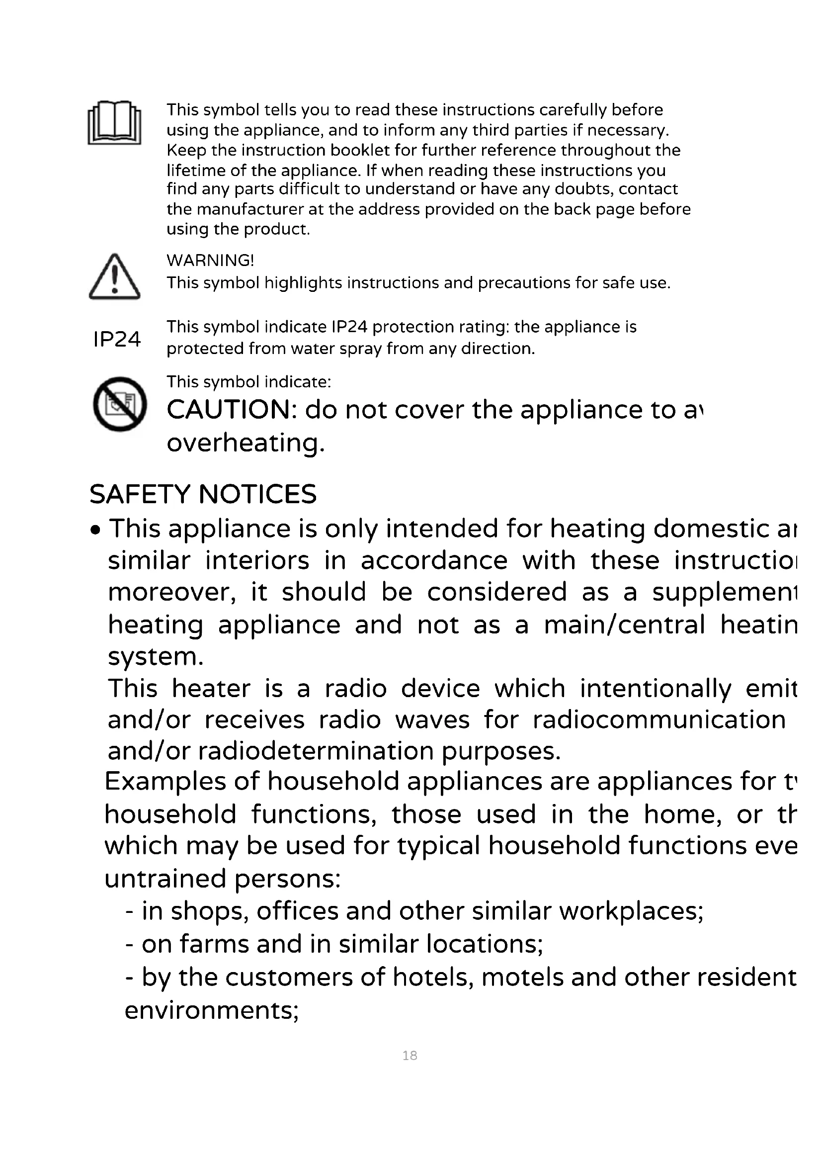 - This appliance is only intended for heating domestic and similar interiors in accordance with these instructions; moreover, it should be considered as a supplement heating appliance and not as a main/central heating system.