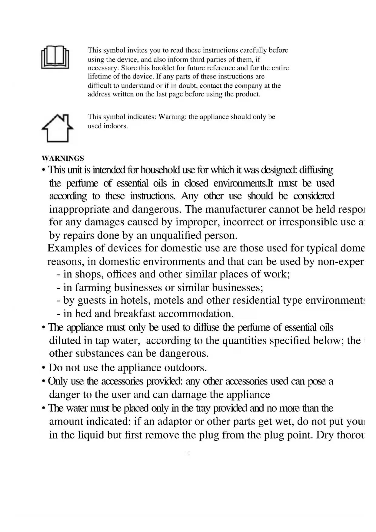 - This unit is intended for household use for which it was designed: diffusing the perfume of essential oils in closed environments.It must be used according to these instructions. Any other use should be considered inappropriate and dangerous. The manufacturer cannot be held responsible for any damages caused by improper, incorrect or irresponsible use and/or by repairs done by an unqualified person. Examples of devices for domestic use are those used for typical domestic reasons, in domestic environments and that can be used by non-experts: - in shops, offices and other similar places of work; - in farming businesses or similar businesses; - by guests in hotels, motels and other residential type environments; - in bed and breakfast accommodation.