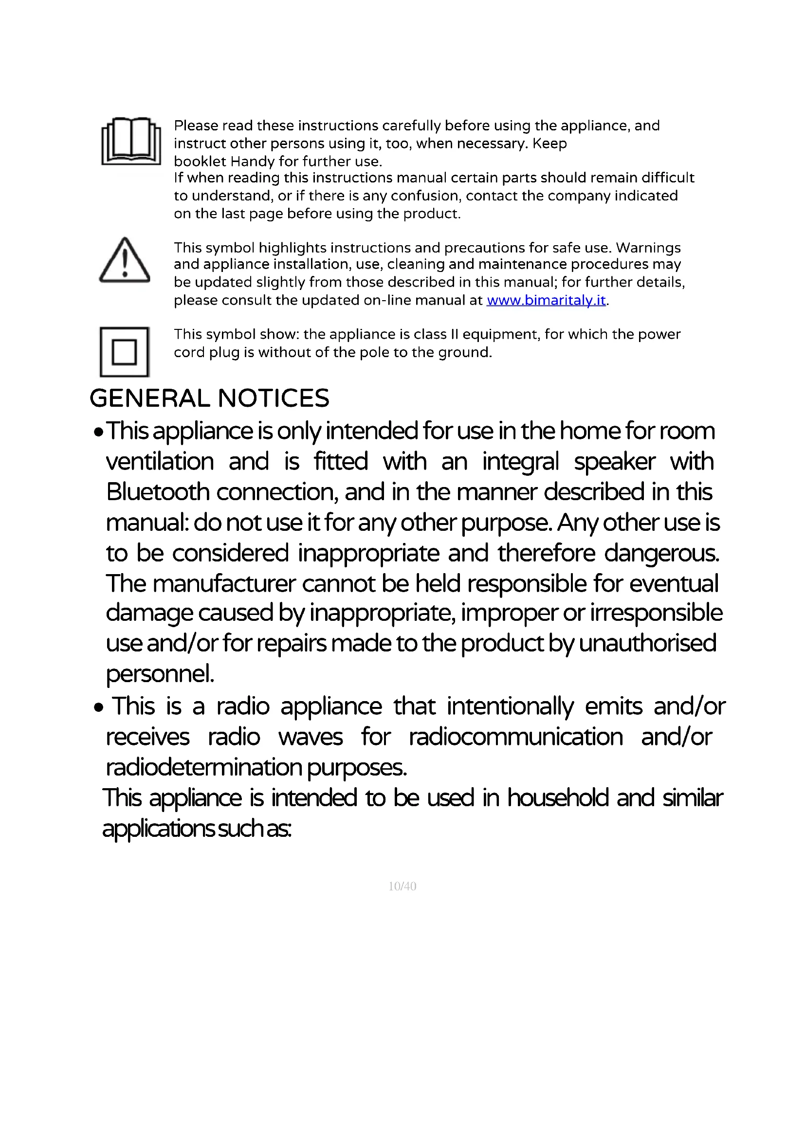 Please read these instructions carefully before using the appliance, and instruct other persons using it, too, when necessary. Keep booklet Handy for further use. If when reading this instructions manual certain parts should remain difficult to understand, or if there is any confusion, contact the company indicated on the last page before using the product. This symbol highlights instructions and precautions for safe use. Warnings and appliance installation, use, cleaning and maintenance procedures may be updated slightly from those described in this manual; for further details, please consult the updated on-line manual at www.bimaritaly.it.