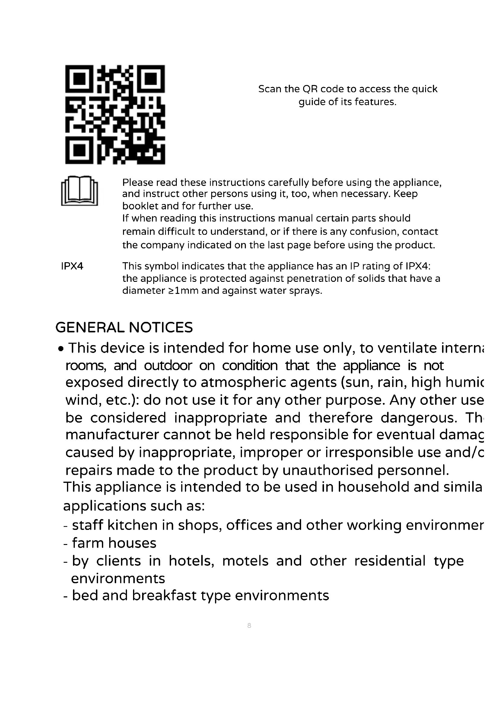 This device is intended for home use only, to ventilate internal rooms, and outdoor on condition that the appliance is not exposed directly to atmospheric agents (sun, rain, high humid wind, etc.): do not use it for any other purpose. Any other use be considered inappropriate and therefore dangerous. The manufacturer cannot be held responsible for eventual damage caused by inappropriate, improper or irresponsible use and/c repairs made to the product by unauthorised personnel. This appliance is intended to be used in household and simila applications such as: