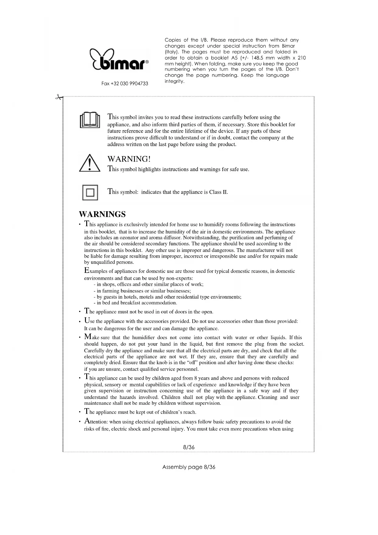 Copies of the I/B. Please reproduce them without any changes except under special instruction from Bimar (Italy). The pages must be reproduced and folded in order to obtain a booklet A5 (+/- 148.5 mm width x 210 mm height). When folding, make sure you keep the good numbering when you turn the pages of the I/B. Don’t change the page numbering. Keep the language integrity. 7/36