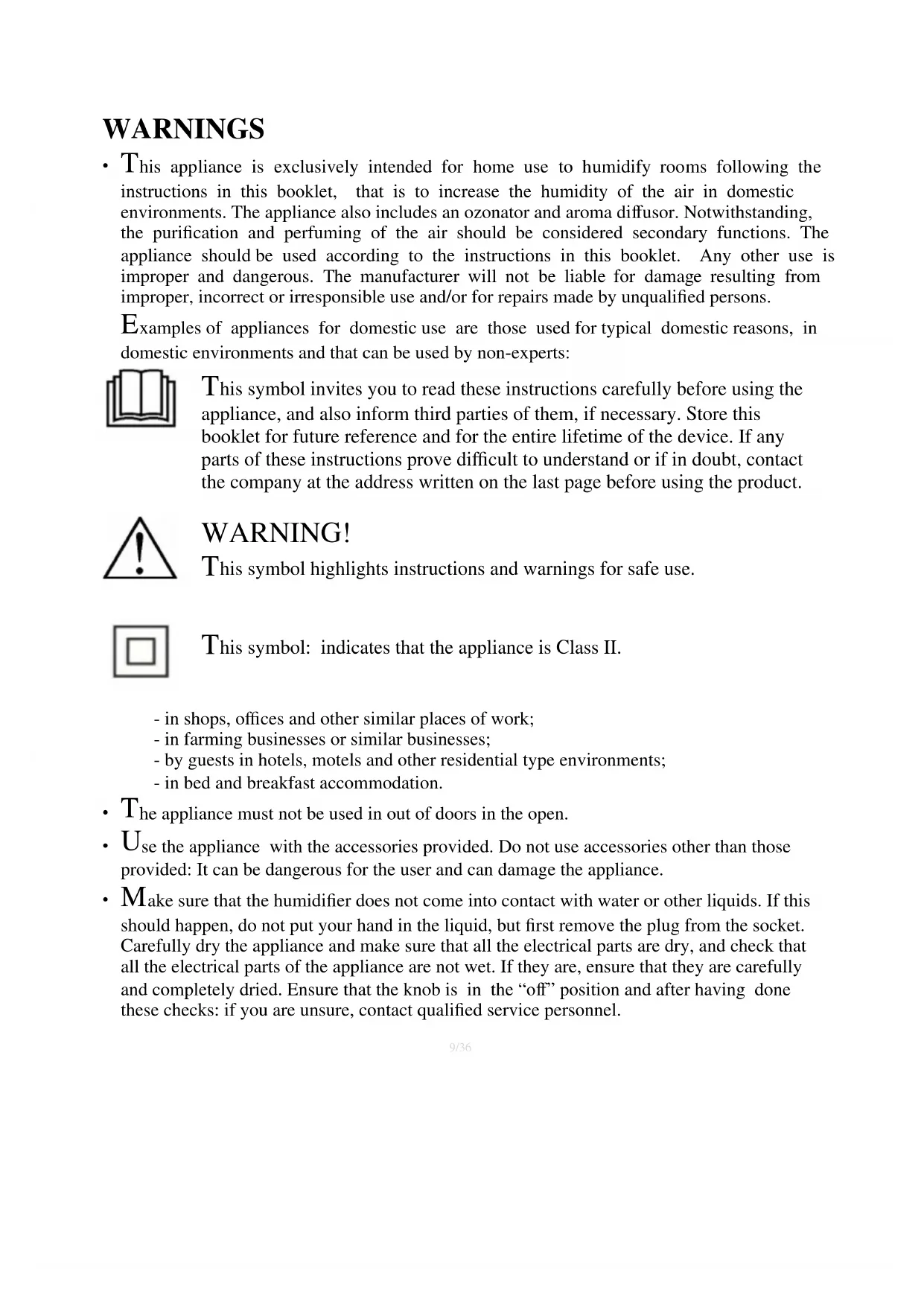 his appliance is exclusively intended for home use to humidify rooms following the instructions in this booklet, that is to increase the humidity of the air in domestic environments. The appliance also includes an ozonator and aroma diffusor. Notwithstanding, the purification and perfuming of the air should be considered secondary functions. The appliance should be used according to the instructions in this booklet. Any other use is improper and dangerous. The manufacturer will not be liable for damage resulting from improper, incorrect or irresponsible use and/or for repairs made by unqualified persons.