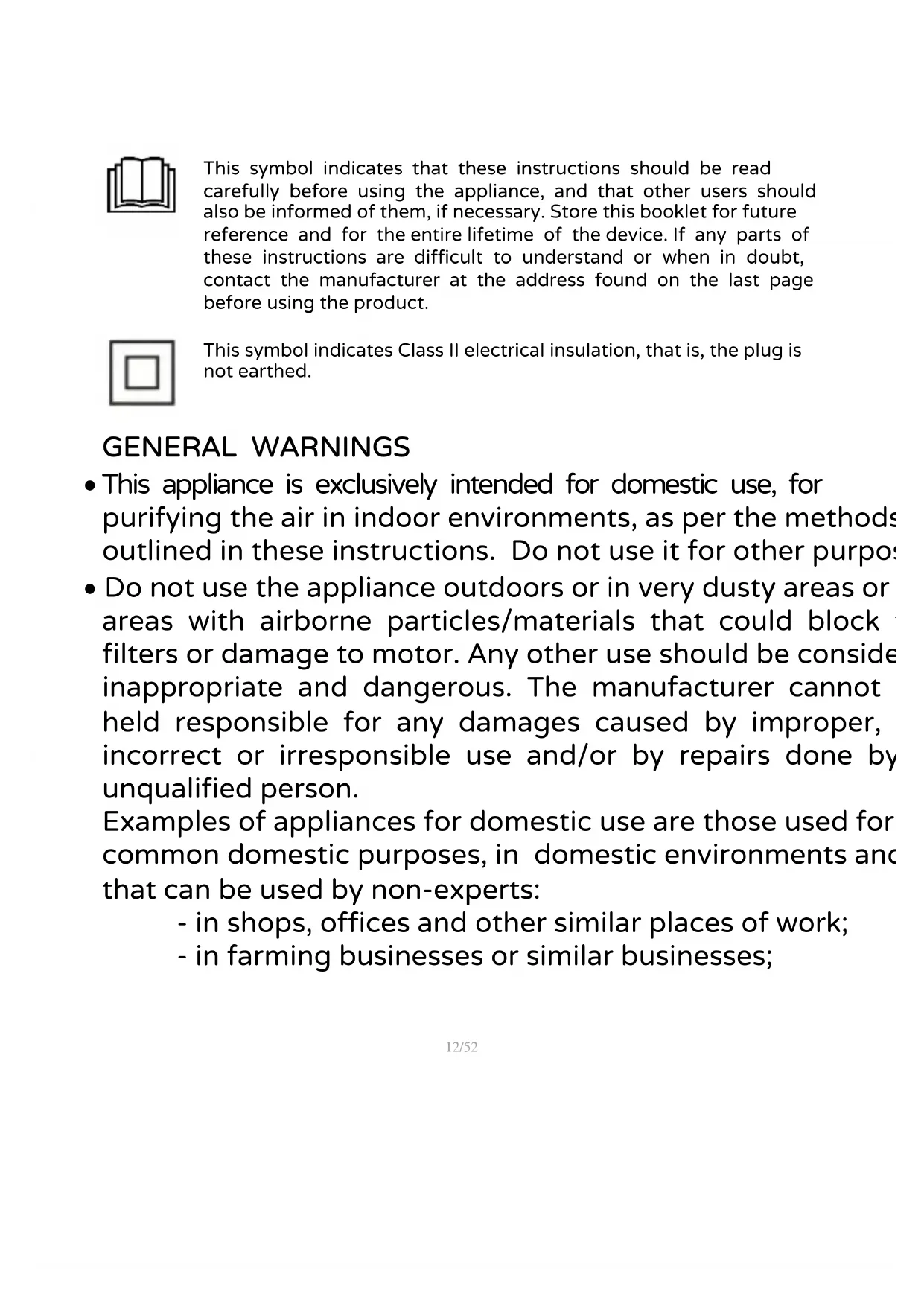 GENERAL WARNINGS This appliance is exclusively intended for domestic use, for purifying the air in indoor environments, as per the methods outlined in these instructions. Do not use it for other purposes. Do not use the appliance outdoors or in very dusty areas or in areas with airborne particles/materials that could block the filters or damage to motor. Any other use should be considered inappropriate and dangerous. The manufacturer cannot be held responsible for any damages caused by improper, incorrect or irresponsible use and/or by repairs done by an unqualified person. Examples of appliances for domestic use are those used for common domestic purposes, in domestic environments and that can be used by non-experts: - in shops, offices and other similar places of work; - in farming businesses or similar businesses;13/52