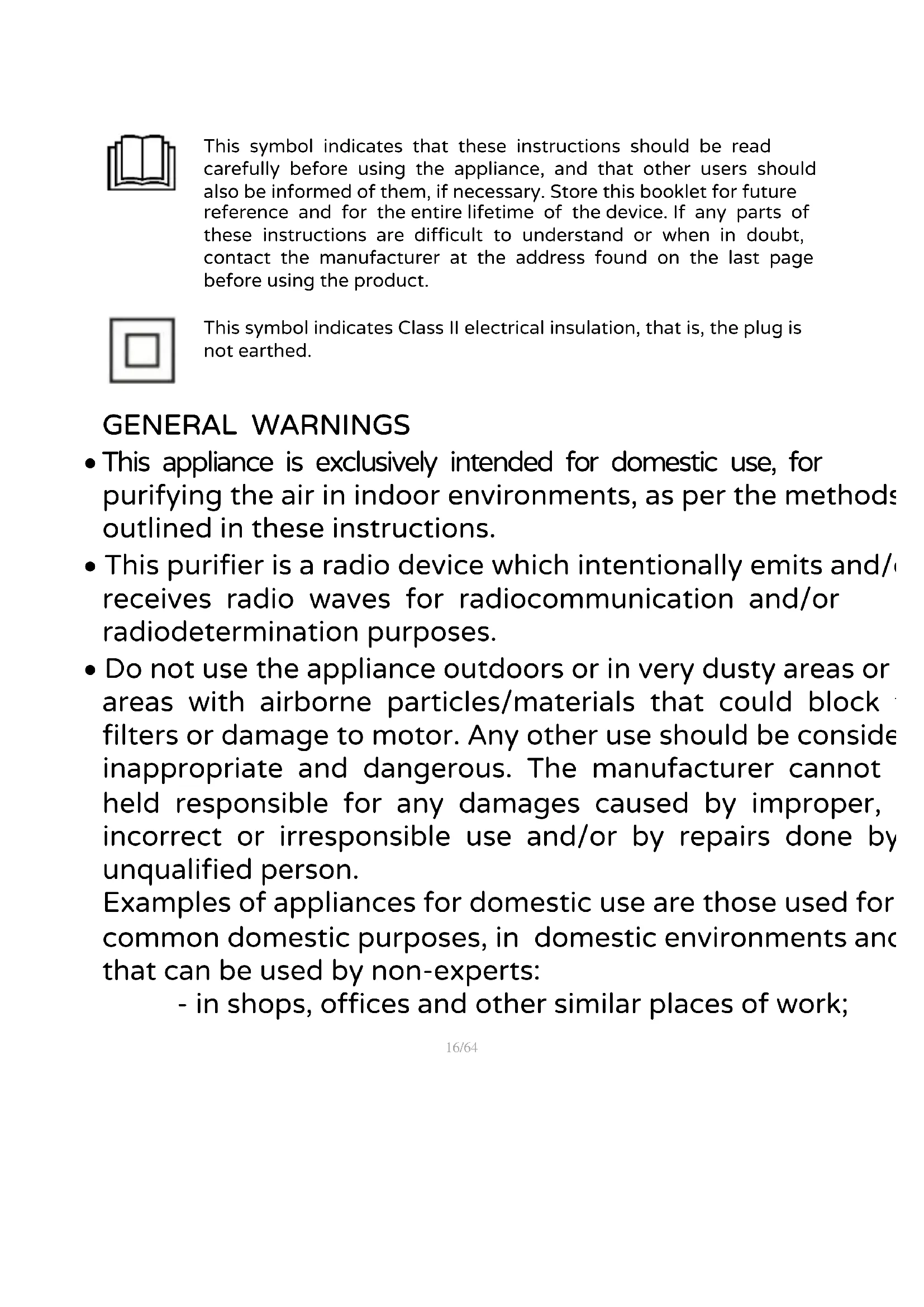 GENERAL WARNINGS This appliance is exclusively intended for domestic use, for purifying the air in indoor environments, as per the methods outlined in these instructions. This purifier is a radio device which intentionally emits and/or receives radio waves for radiocommunication and/or radiodetermination purposes. Do not use the appliance outdoors or in very dusty areas or in areas with airborne particles/materials that could block the filters or damage to motor. Any other use should be considered inappropriate and dangerous. The manufacturer cannot be held responsible for any damages caused by improper, incorrect or irresponsible use and/or by repairs done by an unqualified person. Examples of appliances for domestic use are those used for common domestic purposes, in domestic environments and that can be used by non-experts: - in shops, offices and other similar places of work;17/64