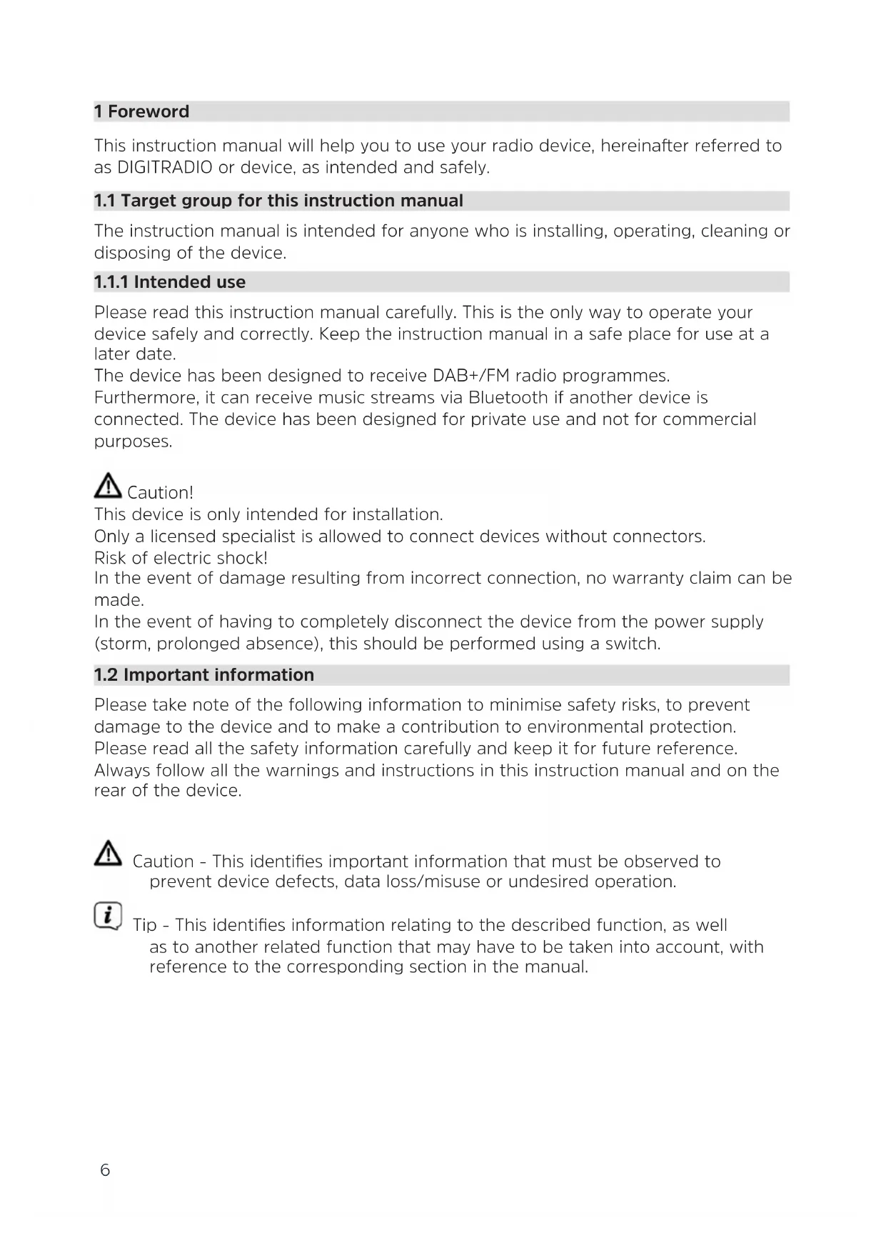 Please read this instruction manual carefully. This is the only way to operate your device safely and correctly. Keep the instruction manual in a safe place for use at a later date. The device has been designed to receive DAB+/FM radio programmes. Furthermore, it can receive music streams via Bluetooth if another device is connected. The device has been designed for private use and not for commercial purposes. Caution! This device is only intended for installation. Only a licensed specialist is allowed to connect devices without connectors. Risk of electric shock! In the event of damage resulting from incorrect connection, no warranty claim can be made. In the event of having to completely disconnect the device from the power supply (storm, prolonged absence), this should be performed using a switch.