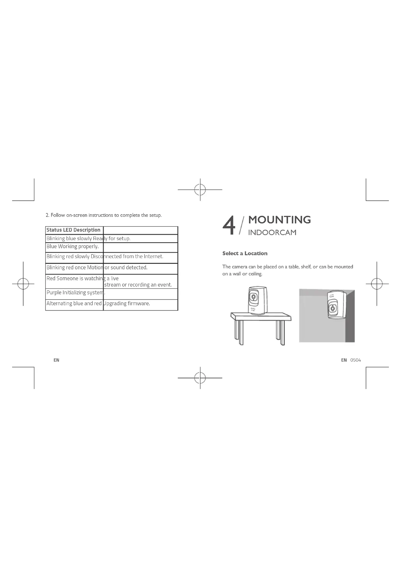 Status LED Description Blinking blue slowly Ready for setup. Blue Working properly. Blinking red slowly Disconnected from the Internet. Blinking red once Motion or sound detected. Red Someone is watching a live stream or recording an event. Purple Initializing system. Alternating blue and red Upgrading firmware. INDOORCAM MOUNTING