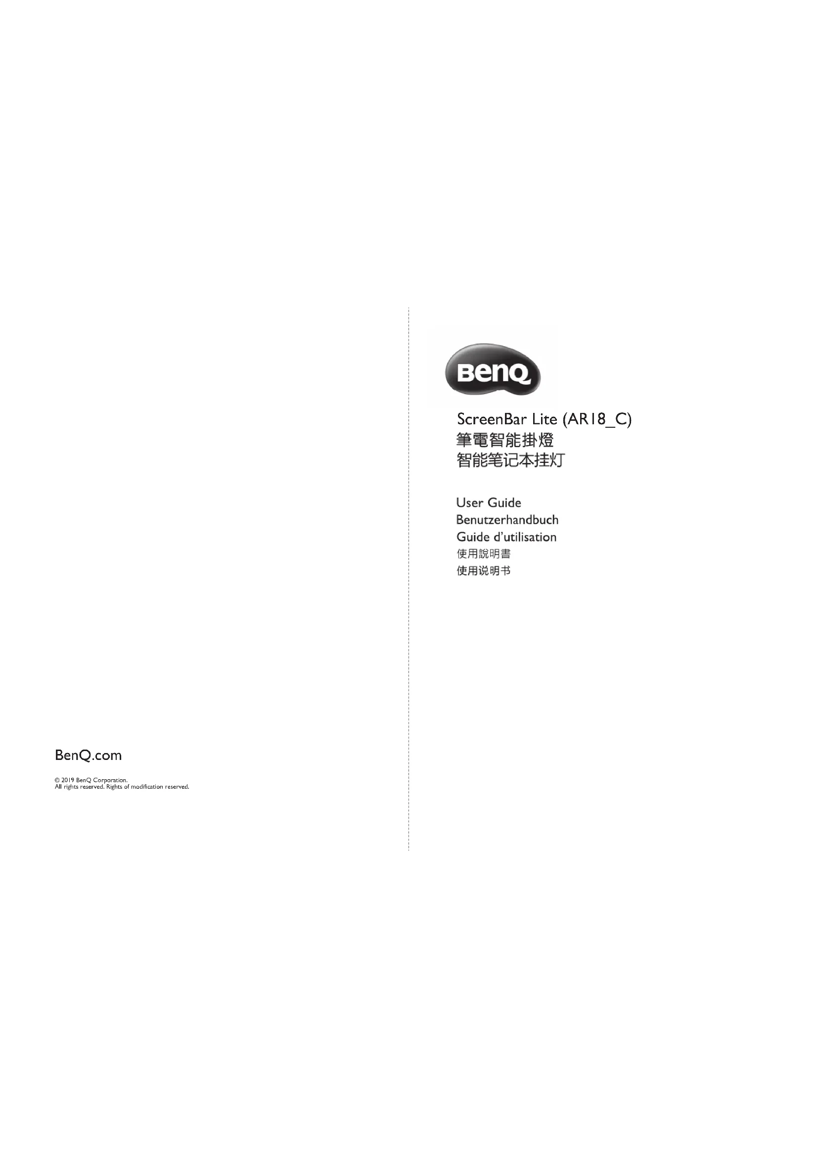 ScreenBar Lite (AR18_C) BenQ.com © 2019 BenQ Corporation. All rights reserved. Rights of modification reserved. P/N: 96-05-00009-G 4J.W4201.0011English Package Contents Check the packaging for the status of the product. If damaged, please contact the place of purchase immediately. The illustrations in this guide are for your reference only and may look different from the appearance of the actual product. For Your Safety
