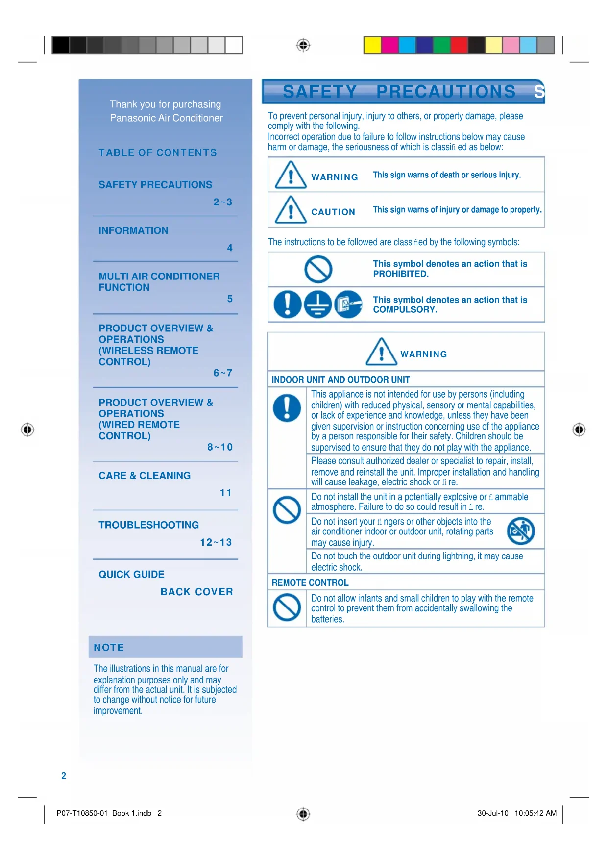 This appliance is not intended for use by persons (including children) with reduced physical, sensory or mental capabilities, or lack of experience and knowledge, unless they have been given supervision or instruction concerning use of the appliance by a person responsible for their safety. Children should be supervised to ensure that they do not play with the appliance. Please consult authorized dealer or specialist to repair, install, remove and reinstall the unit. Improper installation and handling will cause leakage, electric shock or fi re. Do not install the unit in a potentially explosive or fl ammable atmosphere. Failure to do so could result in fi re. Do not insert your fi ngers or other objects into the air conditioner indoor or outdoor unit, rotating parts may cause injury. Do not touch the outdoor unit during lightning, it may cause electric shock. REMOTE CONTROL Do not allow infants and small children to play with the remote control to prevent them from accidentally swallowing the batteries. P07-T10850-01_Book 1.indb 2P07-T10850-01_Book 1.indb 2 30-Jul-10 10:05:42 AM30-Jul-10 10:05:42 AM3 ENGLISH WARNING CAUTION WARNING