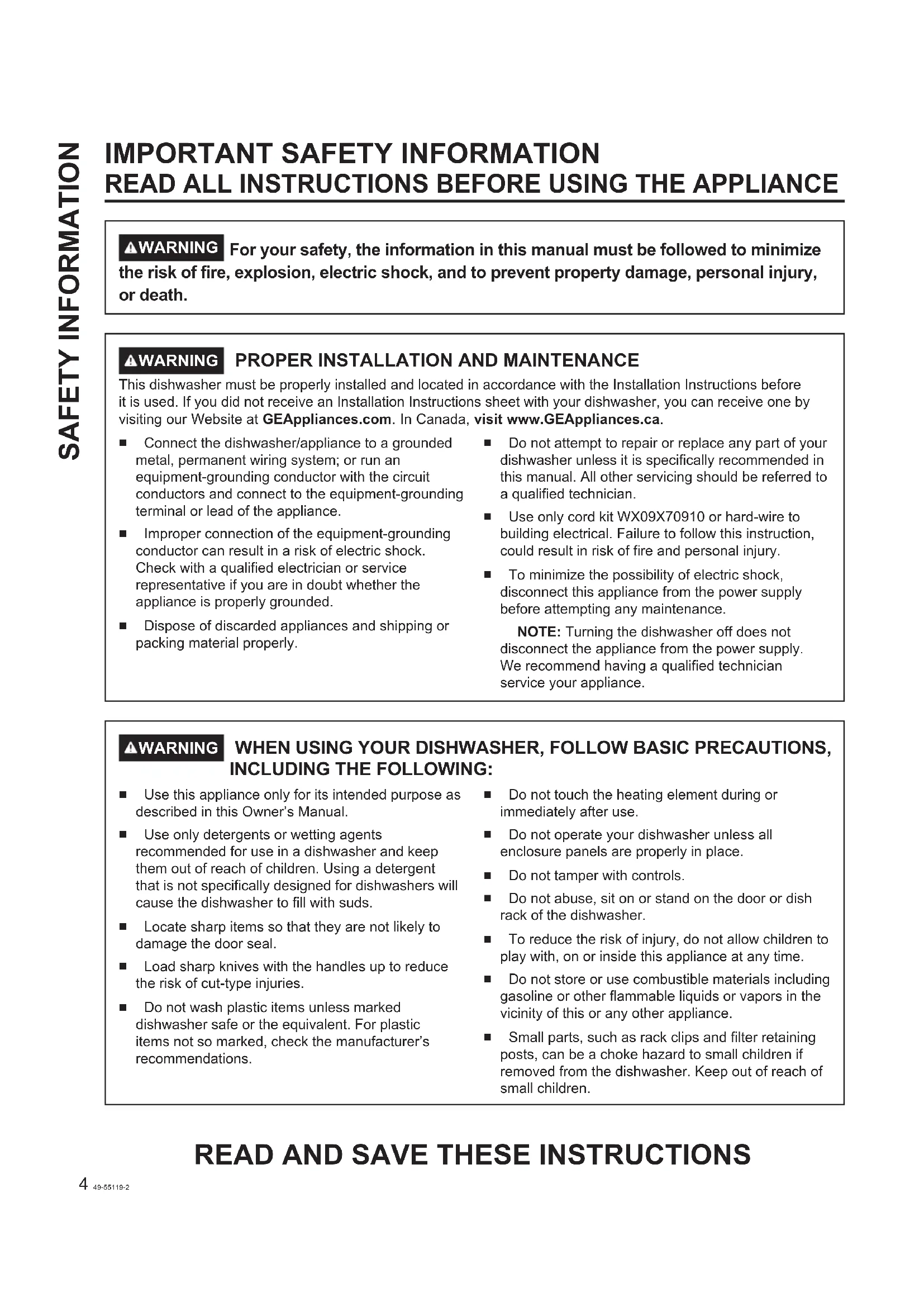 Your sole and exclusive remedy is product repair as provided in this Limited Warranty. Any implied warranties, including the implied warranties of merchantability or fitness for a particular purpose, are limited to one year or the shortest period allowed by law.26 49-55119-2 Consumer Support CONSUMER SUPPORT GE Appliances Website Have a question or need assistance with your appliance? Try the GE Appliances Website 24 hours a day, any day of the year! You can also shop for more great GE Appliances products and take advantage of all our on-line support services designed for your convenience. In the US: GEAppliances.com Register Your Appliance Register your new appliance on-line at your convenience! Timely product registration will allow for enhanced communication and prompt service under the terms of your warranty, should the need arise. You may also mail in the pre-printed registration card included in the packing material. In the US: GEAppliances.com/register Schedule Service Expert GE Appliances repair service is only one step away from your door. Get on-line and schedule your service at your convenience any day of the year. In the US: GEAppliances.com/ge/service-and-support/service.htm or call 800.432.2737 during normal business hours. Extended Warranties Purchase a GE Appliances extended warranty and learn about special discounts that are available while your warranty is still in effect. You can purchase it on-line anytime. GE Appliances Services will still be there after your warranty expires. In the US: GEAppliances.com/ge/service-and-support/shop-for-extended-service-plans.htm or call 800.626.2224 during normal business hours. Remote Connectivity For assistance with wireless network connectivity (for models with remote enable), visit our website at GEAppliances.com/ge/connected-appliances/ or call 800.220.6899 in the US. Parts and Accessories Individuals qualified to service their own appliances can have parts or accessories sent directly to their homes (VISA, MasterCard and Discover cards are accepted). Order on-line today 24 hours every day. In the US: GEApplianceparts.com or by phone at 877.959.8688 during normal business hours. Instructions contained in this manual cover procedures to be performed by any user. Other servicing generally should be referred to qualified service personnel. Caution must be exercised, since improper servicing may cause unsafe operation. Contact Us If you are not satisfied with the service you receive from GE Appliances, contact us on our Website with all the details including your phone number, or write to: In the US: General Manager, Customer Relations | GE Appliances, Appliance Park | Louisville, KY 40225 GEAppliances.com/ge/service-and-support/contact.htmInscrivez ci-dessous les numéros de modèle et de série N° de modèle ____________ N° de série ______________ Ils se trouvent sur la paroi de la cuve, à l’intérieur de la porte. GE est une marque déposée de General Electric Company. Fabriqué sous licence de marque. MANUEL D’UTILISATION LAVE-VAISSELLE